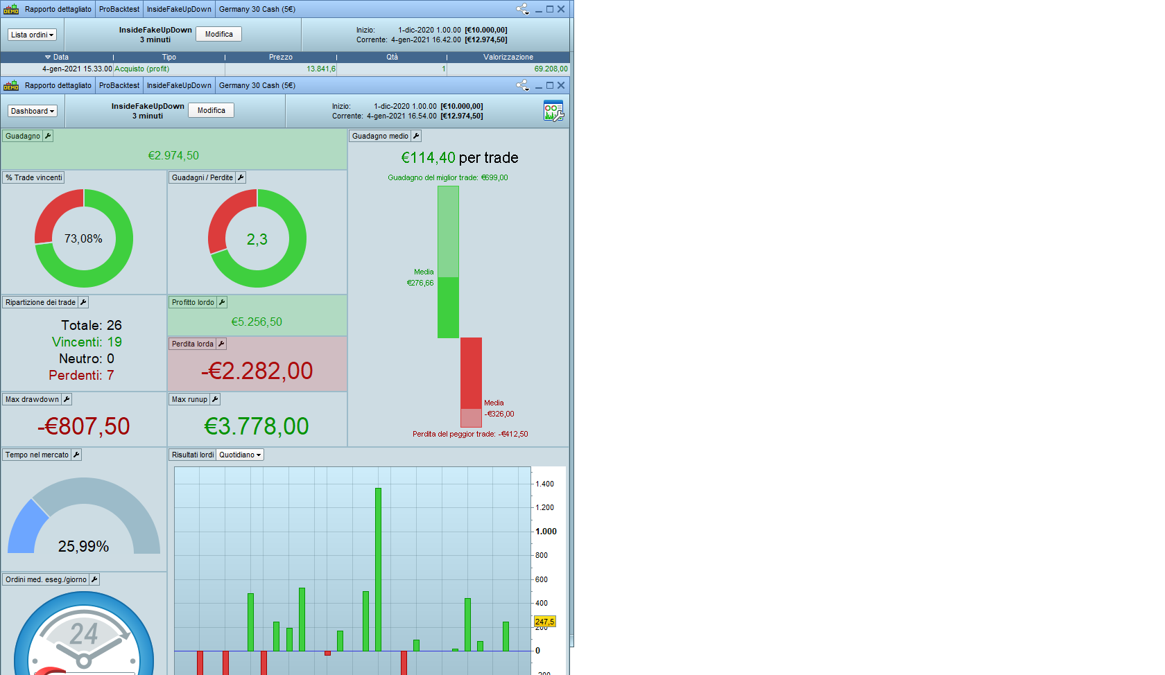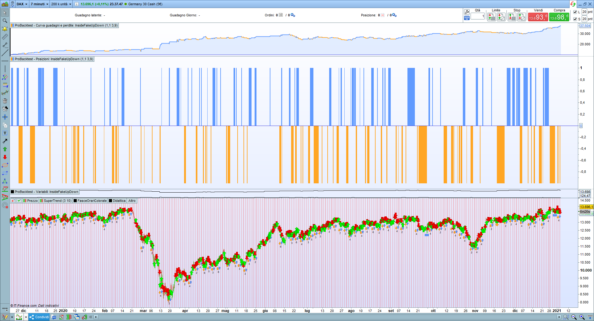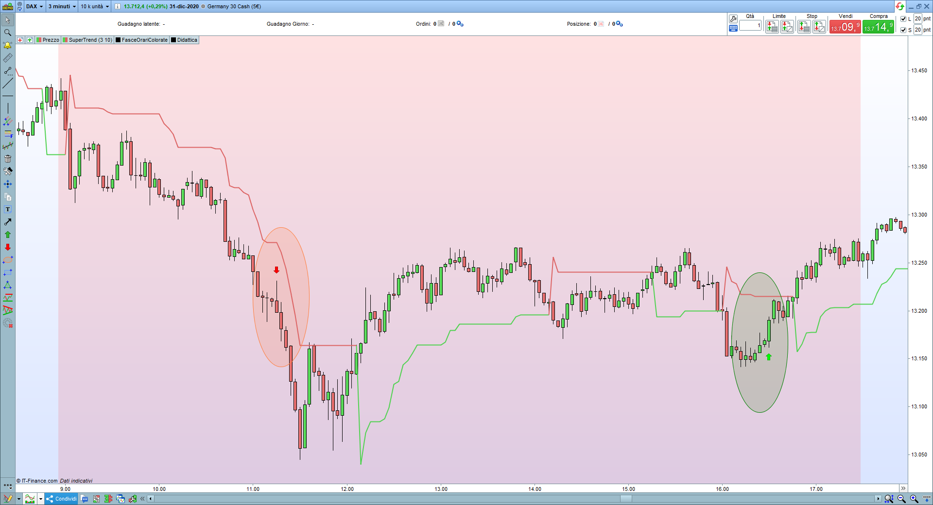 Il 3/12/2020 alle 12:48 c’è un ingresso short a 13255,6. Valore corretto in quanto il prezzo di entrata è calcolato un punto sotto al minimo della seconda barra del pattern che, in questo caso, vale 13.256,8. Il profitto, calcolato come da riga 19 del codice, vale 26,40. Quindi, l’uscita in gain dovrebbe avvenire a 13.230,4. In effetti, come mostra la seconda figura, avviene a 13.209. Perché?