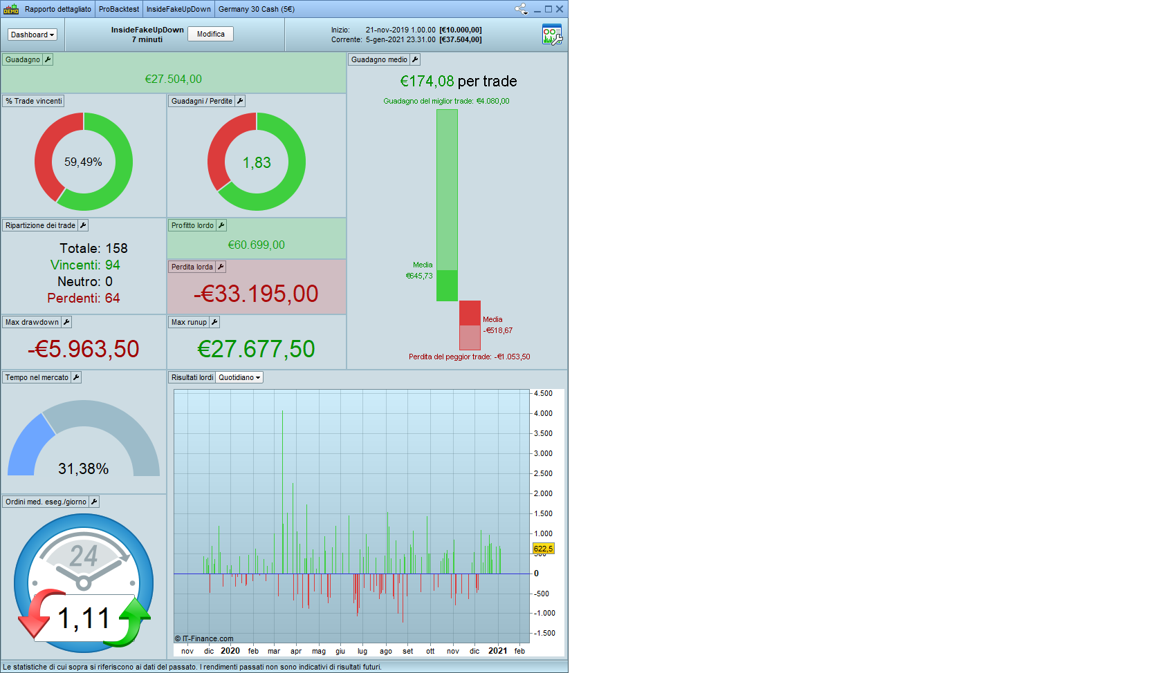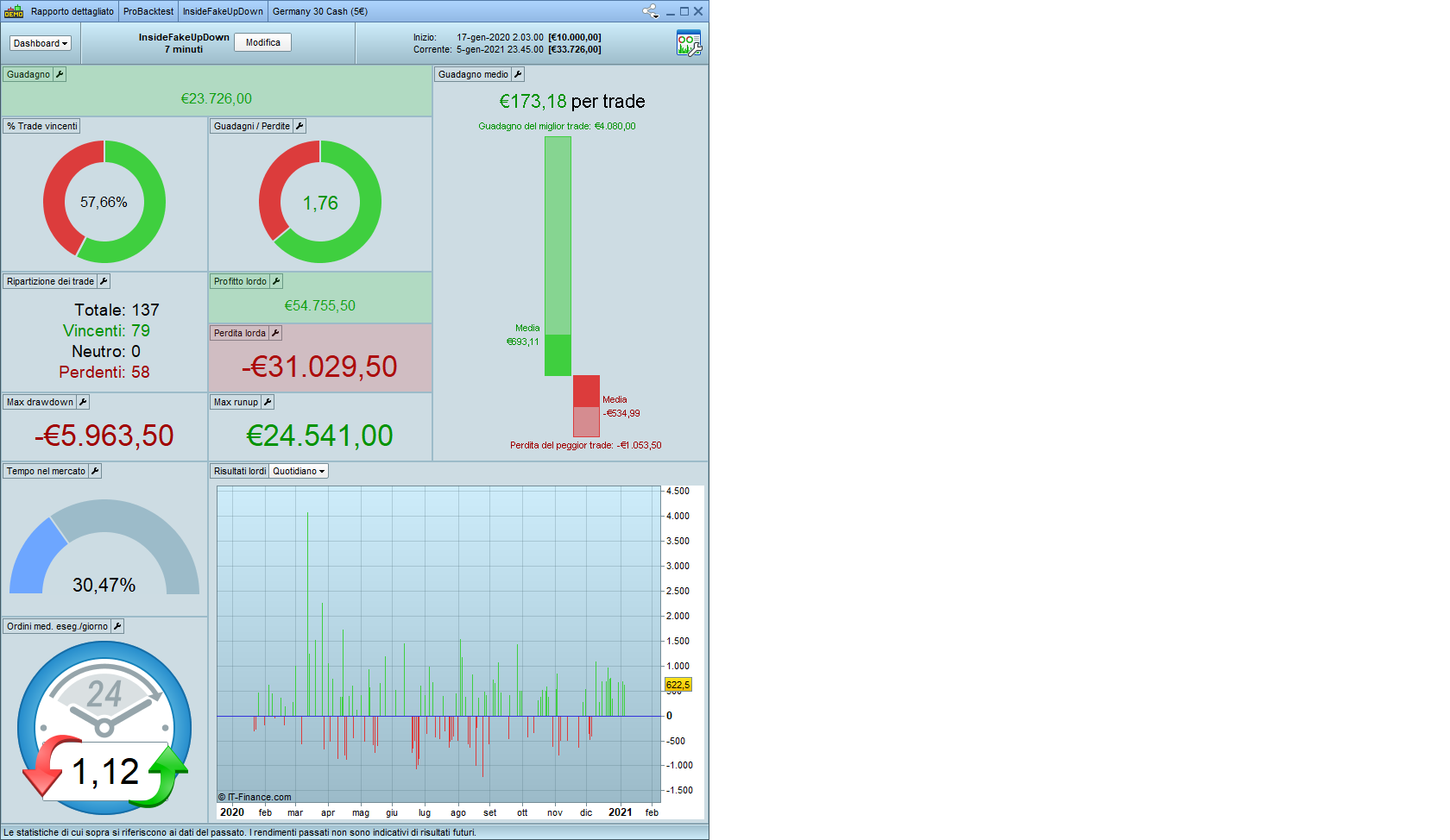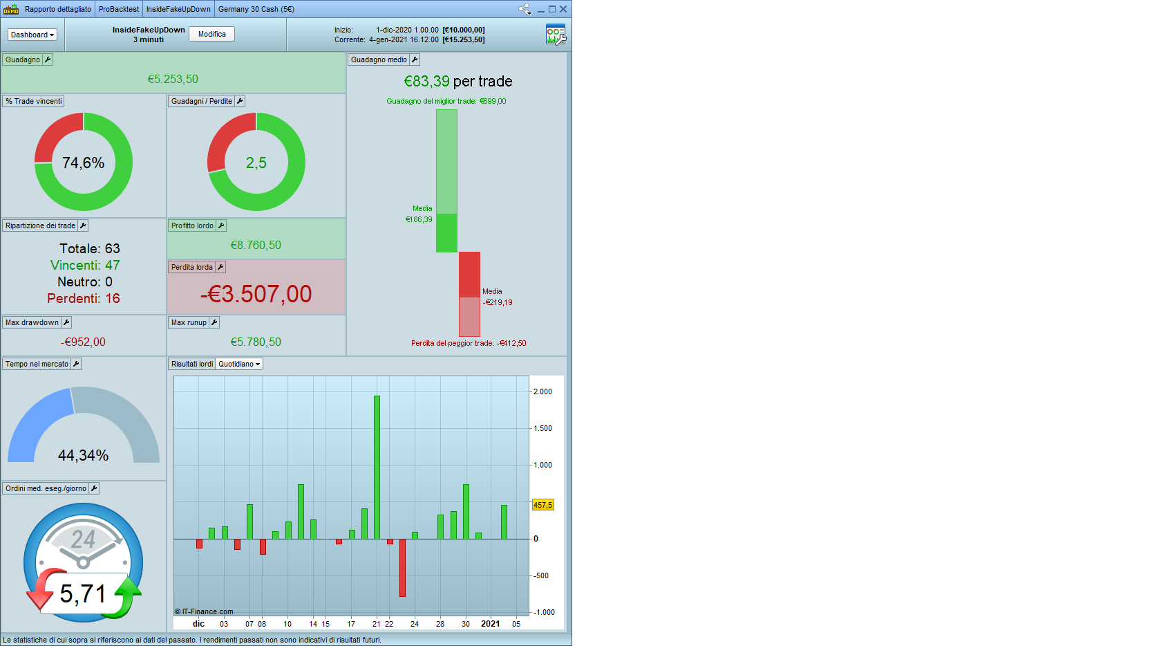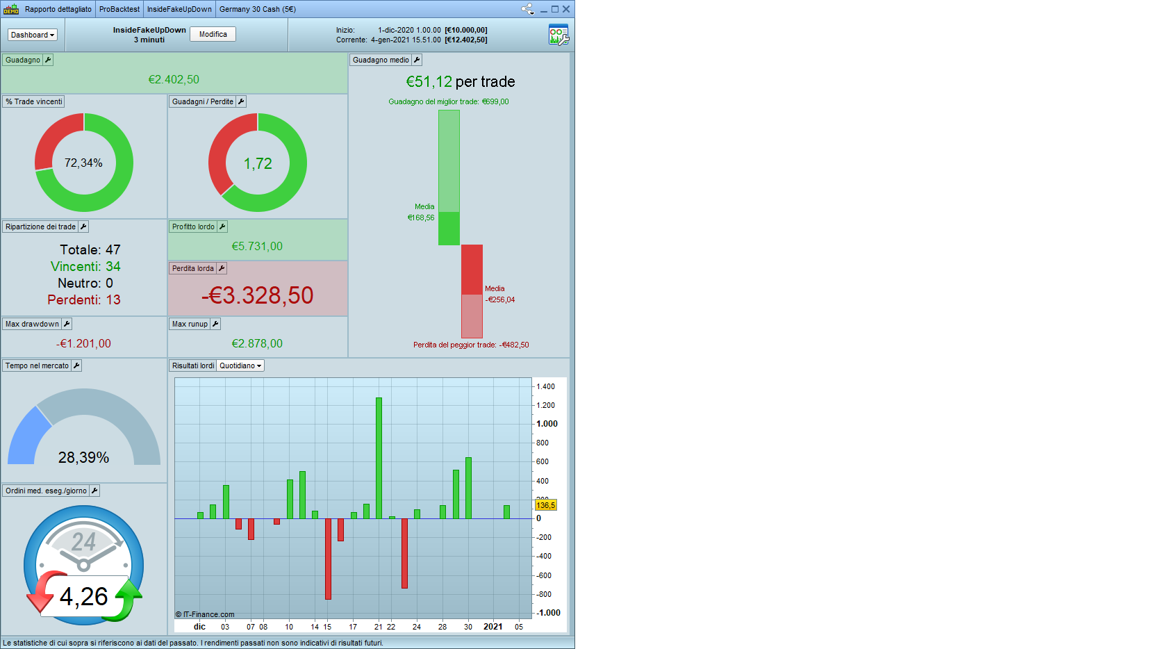 Il 3/12/2020 alle 12:48 c’è un ingresso short a 13255,6. Valore corretto in quanto il prezzo di entrata è calcolato un punto sotto al minimo della seconda barra del pattern che, in questo caso, vale 13.256,8. Il profitto, calcolato come da riga 19 del codice, vale 26,40. Quindi, l’uscita in gain dovrebbe avvenire a 13.230,4. In effetti, come mostra la seconda figura, avviene a 13.209. Perché?