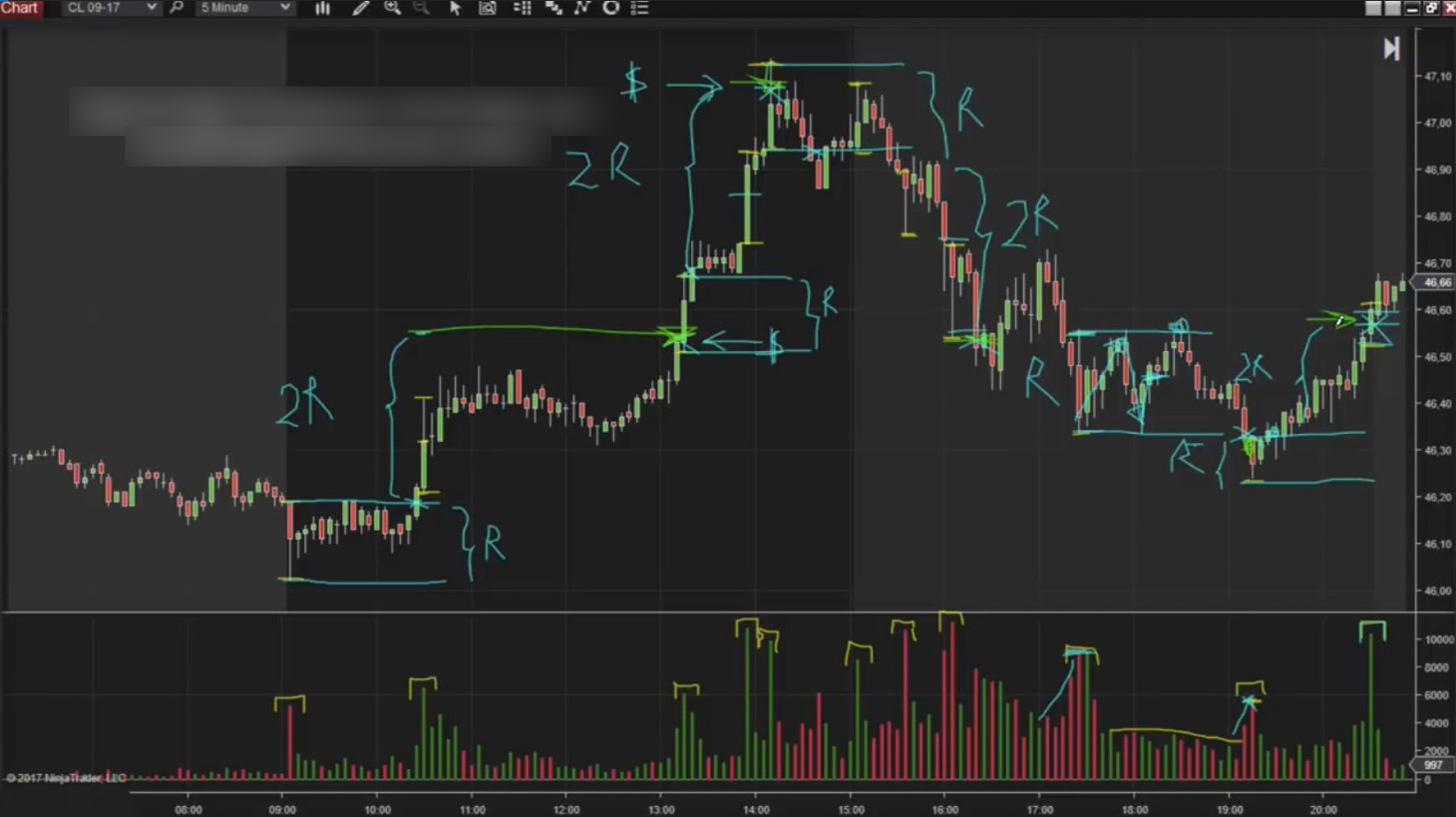 En cuanto aparezca una vela con un volumen exagerado con respecto a las anteriores ( en el ejemplo 200 contratos en el futuro del petróleo en 5 minutos ) a la apertura de la siguiente vela se entra largo o corto en función de hacia donde rompa, con stop en la vela de referencia del alto volumen y relación riesgo beneficio 2 a 1.