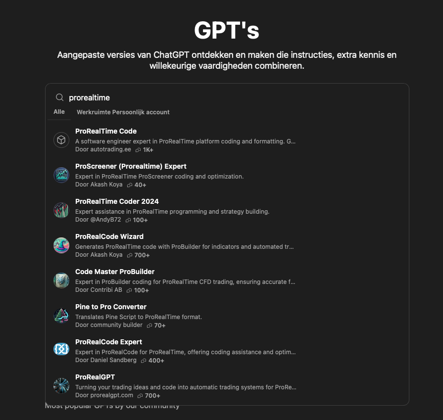 Currently, there are 8 GPTs (in the free version) related to ProRealTime…