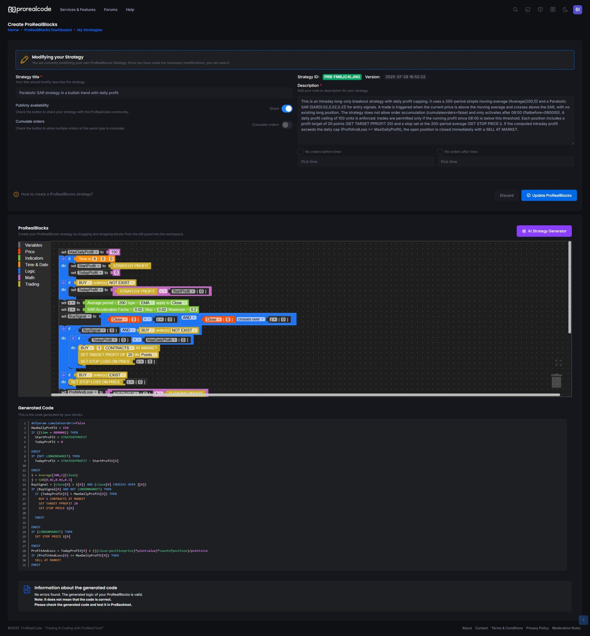 - ProRealBlocks – lets you build ProBuilder code by assembling visual blocks. The code is generated in real time as you connect them. Perfect for learning how to code through block-based reasoning. This one’s always ready (for the new website launch) and currently delivers basic code reasoning based on its built-in knowledge (see attached examples).
