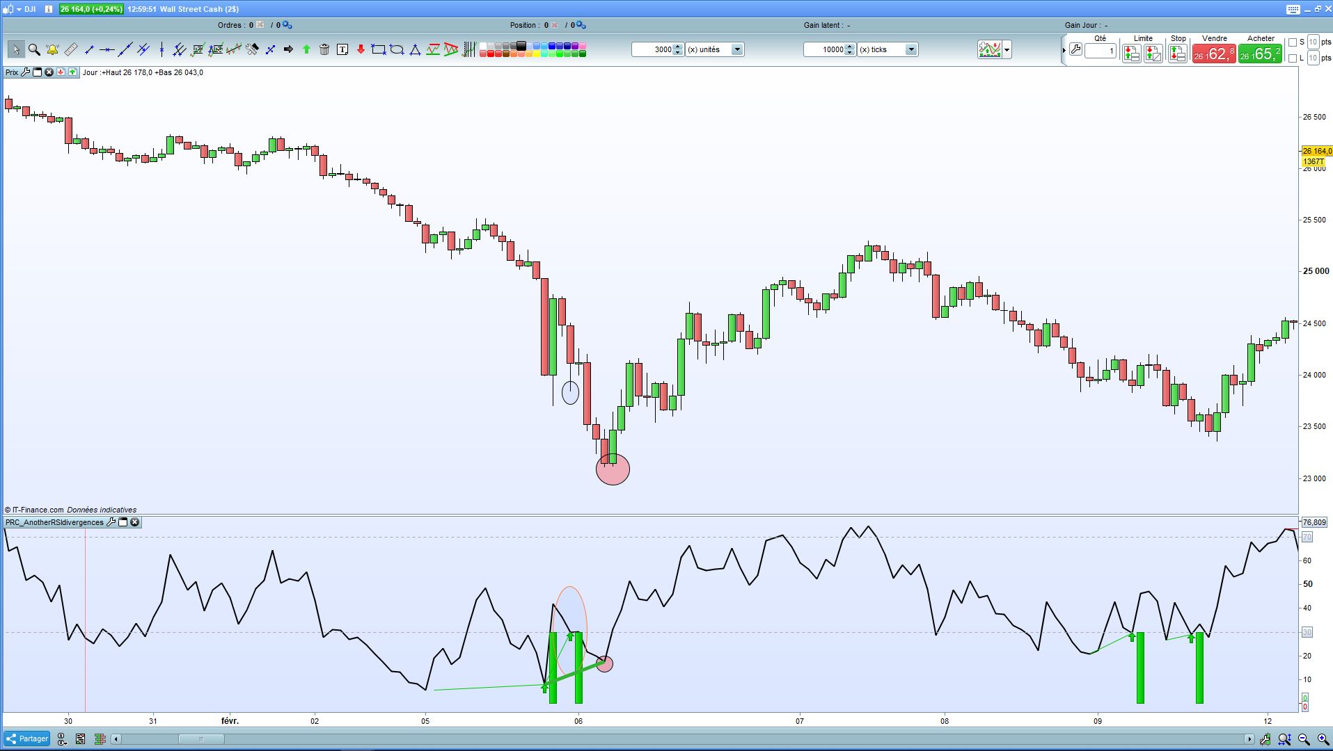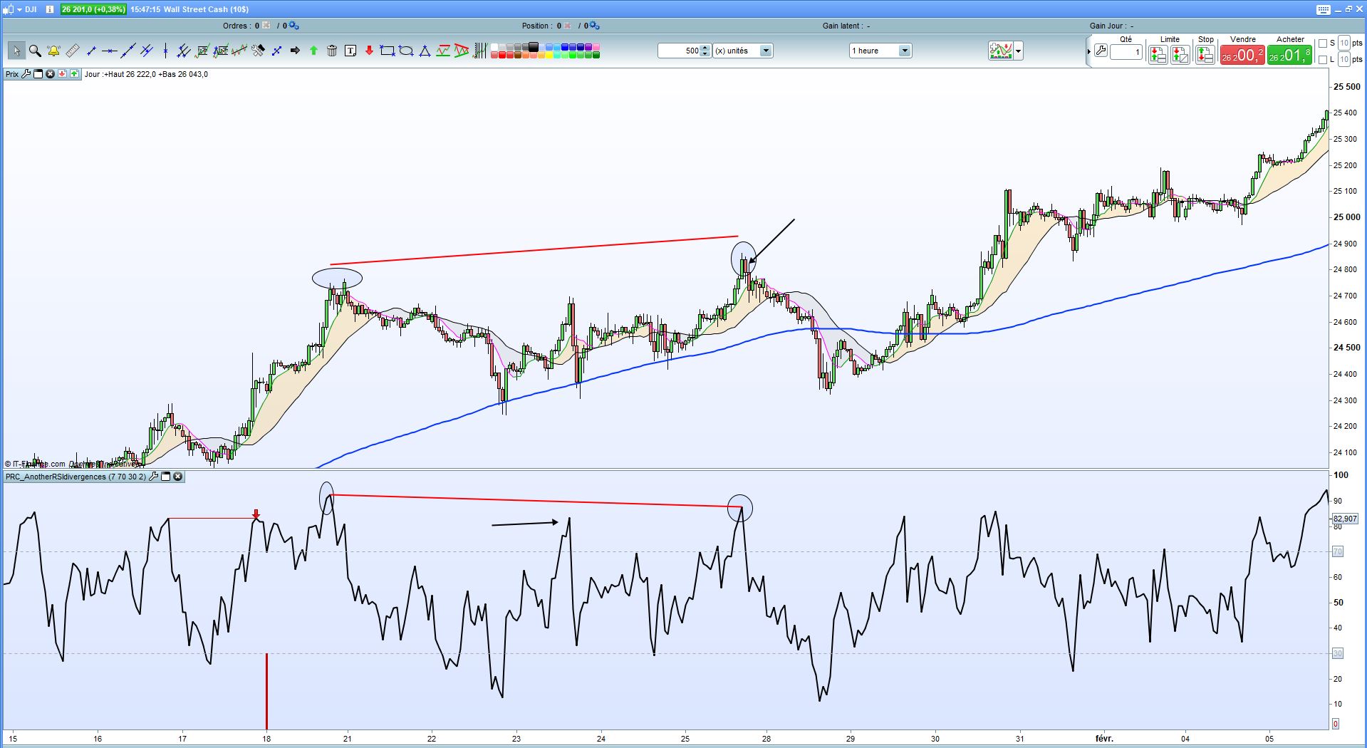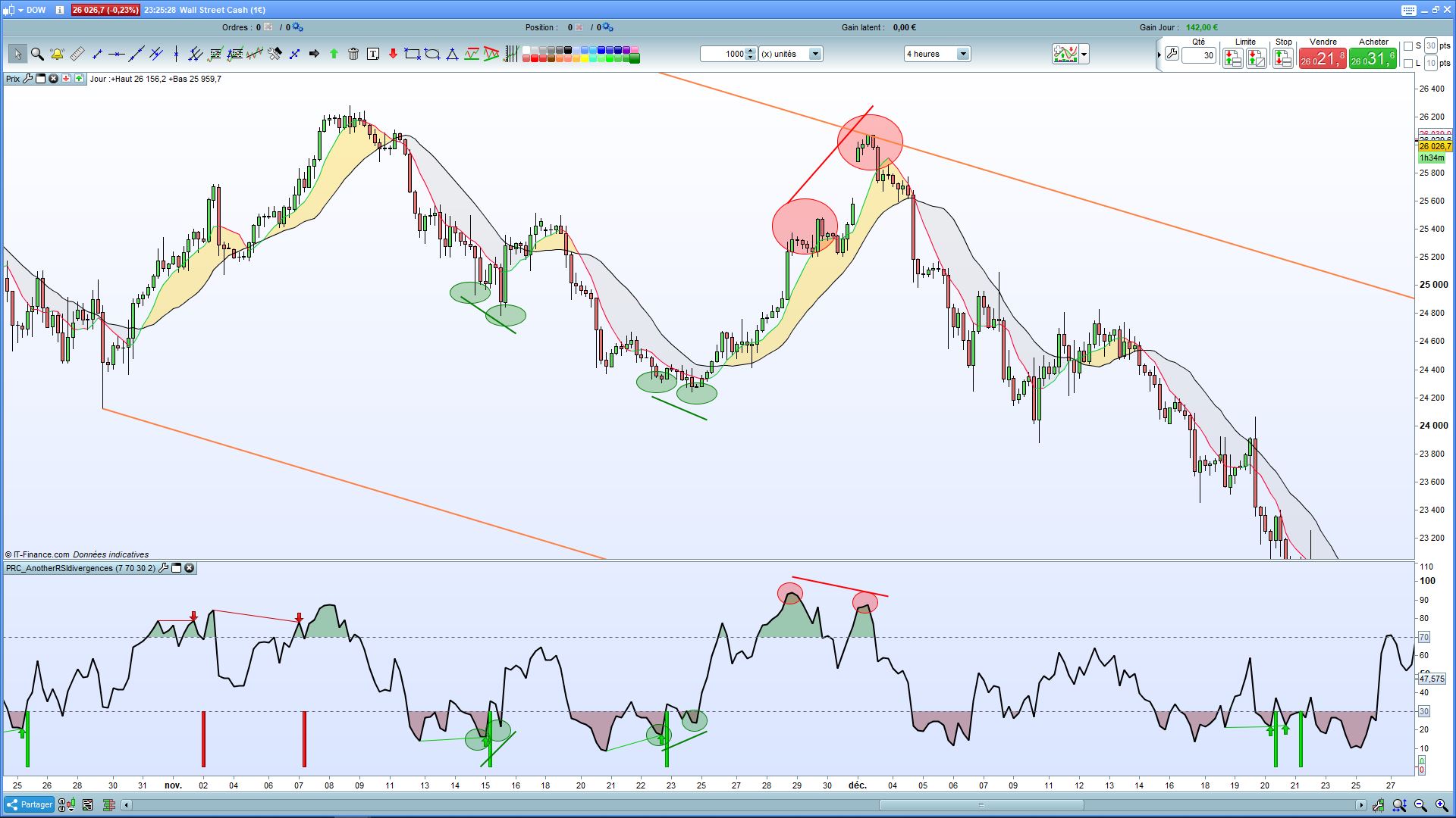 Dans l’exemple pour le signal achat, il indique un signal pour un pic sous la zone 30 et ressort directement (ovale bleu) alors que les prix eux n’ont pas fait de nouveaux plus bas. Il aurait du prendre la zone suivante entourée de ronds rouges.