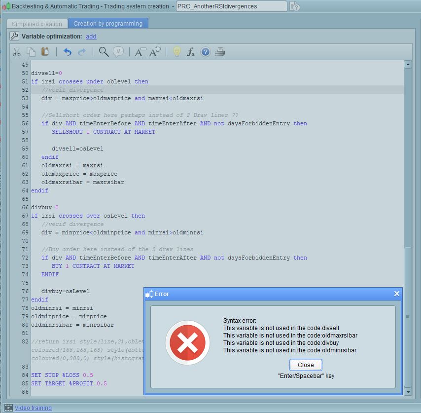 En effet ces variables ne sont plus utiles dans une stratégie de trading automatique, cependant les variables divsell et divbuy avaient pourtant été créées pour ! Puisque les divergences n’étaient que graphique dans l’indicateur, j’avais ajouté ces histogrammes pour les récupérer avec un CALL par exemple. Bref, pas grave, dans ton cas, il suffirait de supprimer les lignes qui font mentionnent ces variables.