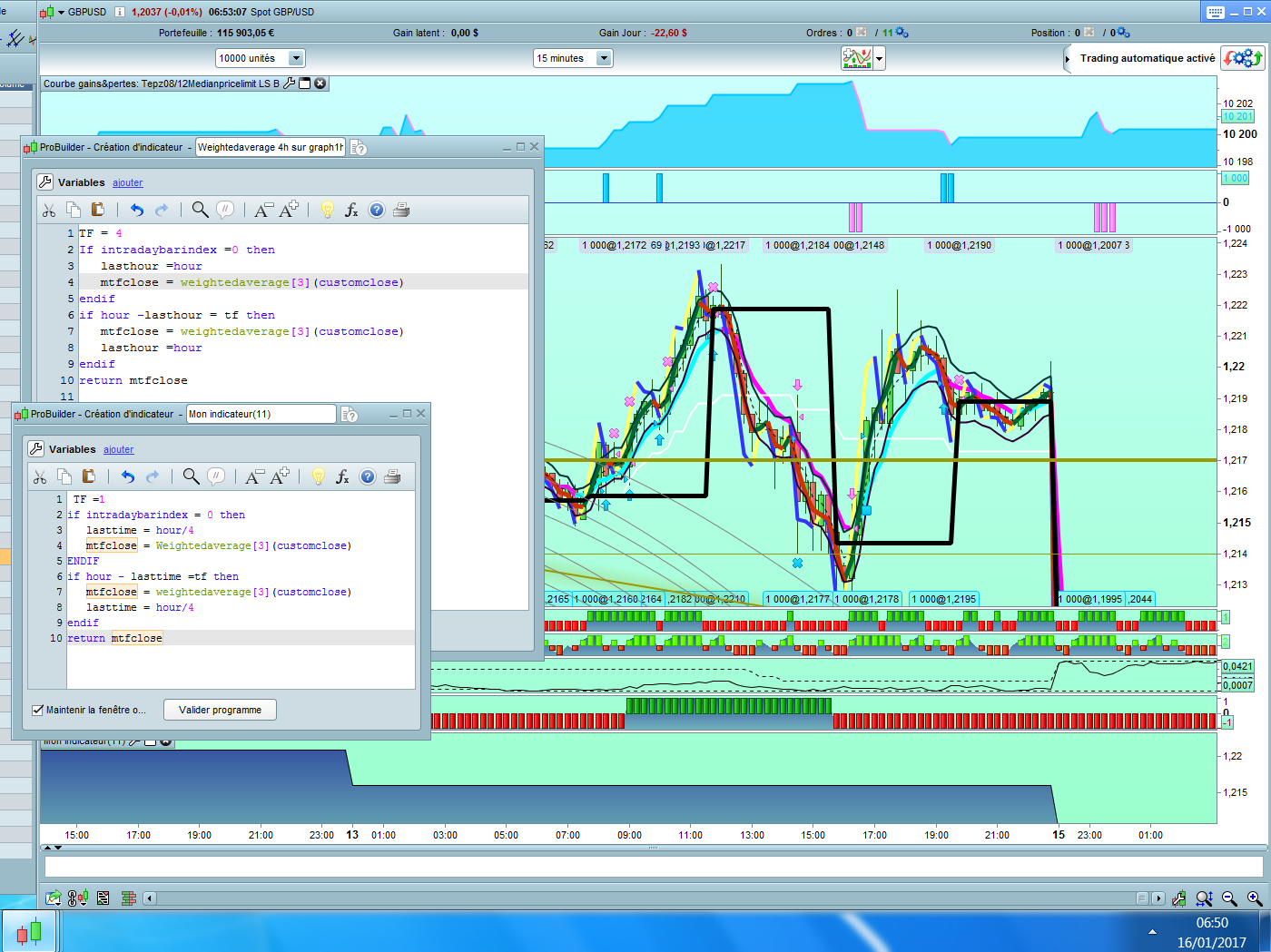 Il est très difficile de pouvoir afficher les véritables informations d’autres unités de temps avec les indicateurs classiques de la plateforme, il faudrait pour cela réécrire leurs formules complètes dans un indicateur (ici donc ta weighted average), et en leurs soumettant les bonnes valeurs OHLC de l’unité de temps que l’on souhaiterait lui faire calculer. Je ne suis pas encore arrivé moi même à faire quelque-chose de propre et universelle pour cela, j’en suis navré. Comme beaucoup je compte sur l’éventuel support multitimeframe à venir pour ProBuilder (ProOrder sera le premier à l’avoir).