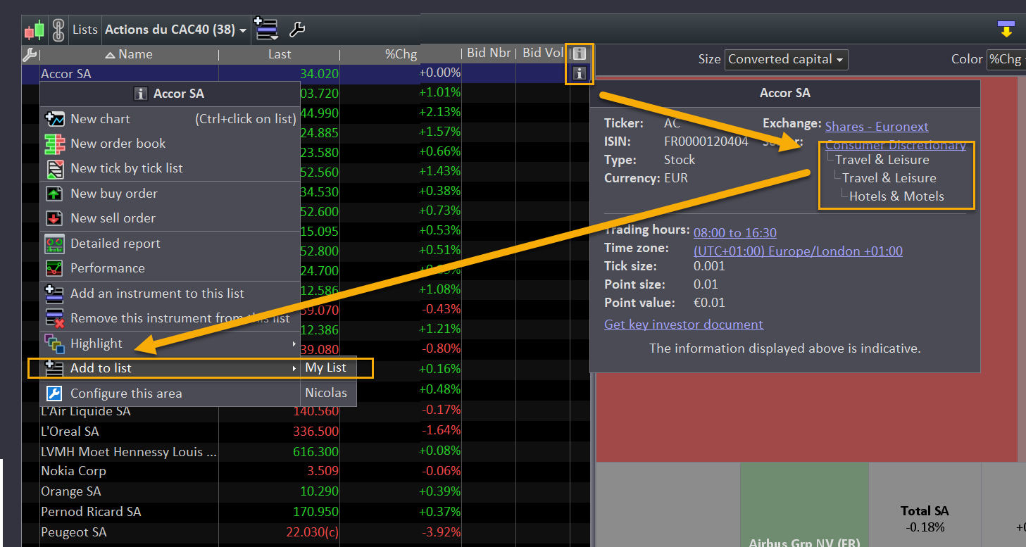 Voilà comment je vois les choses, dans une liste existante, on peut afficher les informations d’une société et par conséquent voir son secteur, ensuite on peut l’ajouter à l’une de ses listes personnelles, donc en créer une par secteur pour les actions éligibles au PEA (voir image).