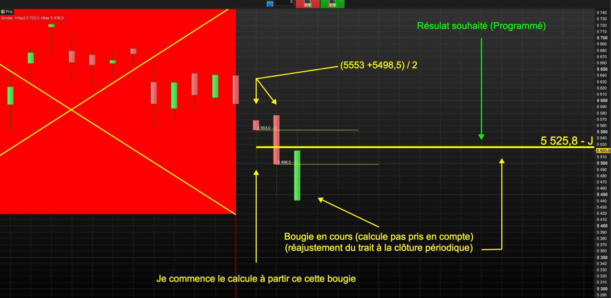 Il faudrait que ça se recalcule seul (boucle for) à la fermeture de la bougie en cours et réajuste la moyenne des clôture (Grosse ligne jaune).
