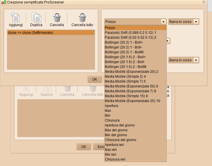 - il secondo è il prezzo di chiusura corrente, che è identico al precedente in quanto è come se la candela chiudesse in quel momento (ProScreener funziona in diretta, non attende la chiusura di una candela)