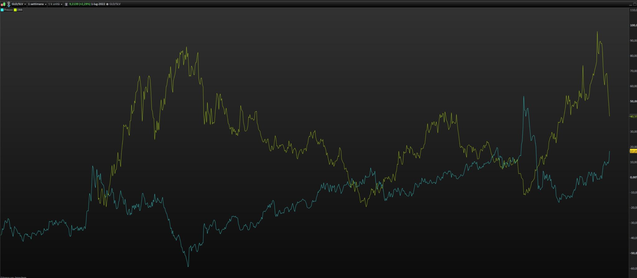 Hello Gianluca, is it possible that the second yellow line that Nicolas is referring to (‘DBB’) is an indicator called “Price comparison / Confronto valore” that you set on an instrument which ticker is ‘DBB’ and added it to the chart?