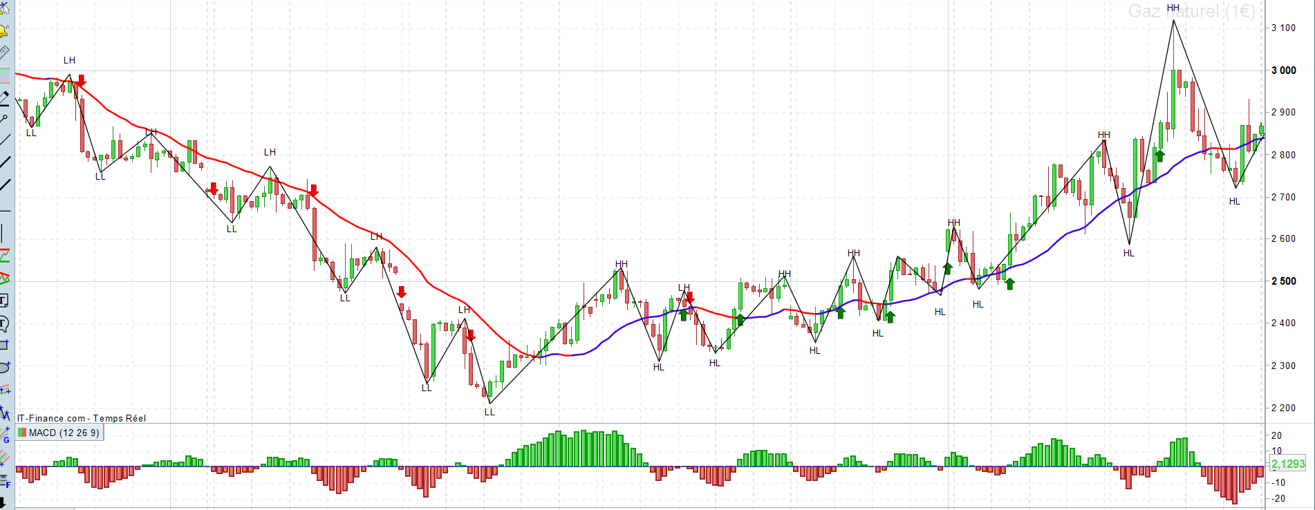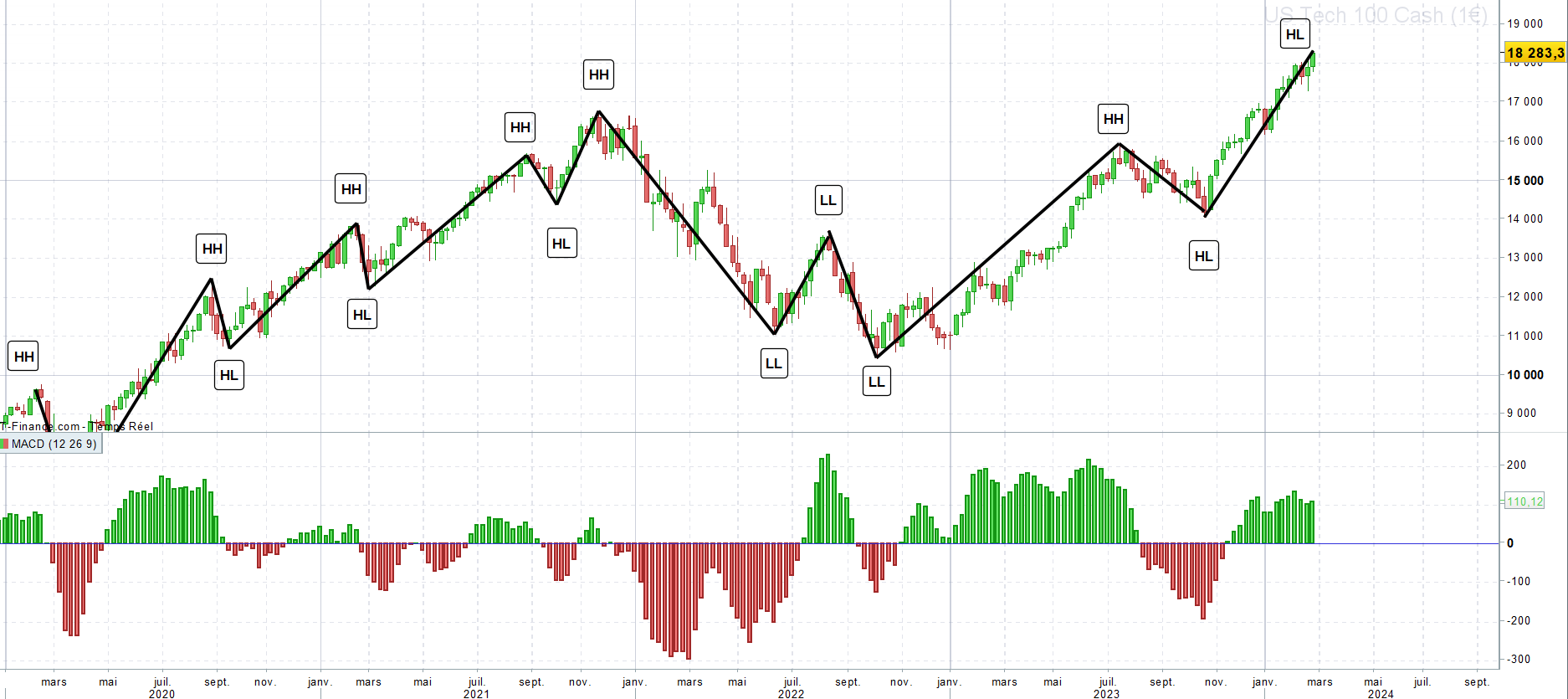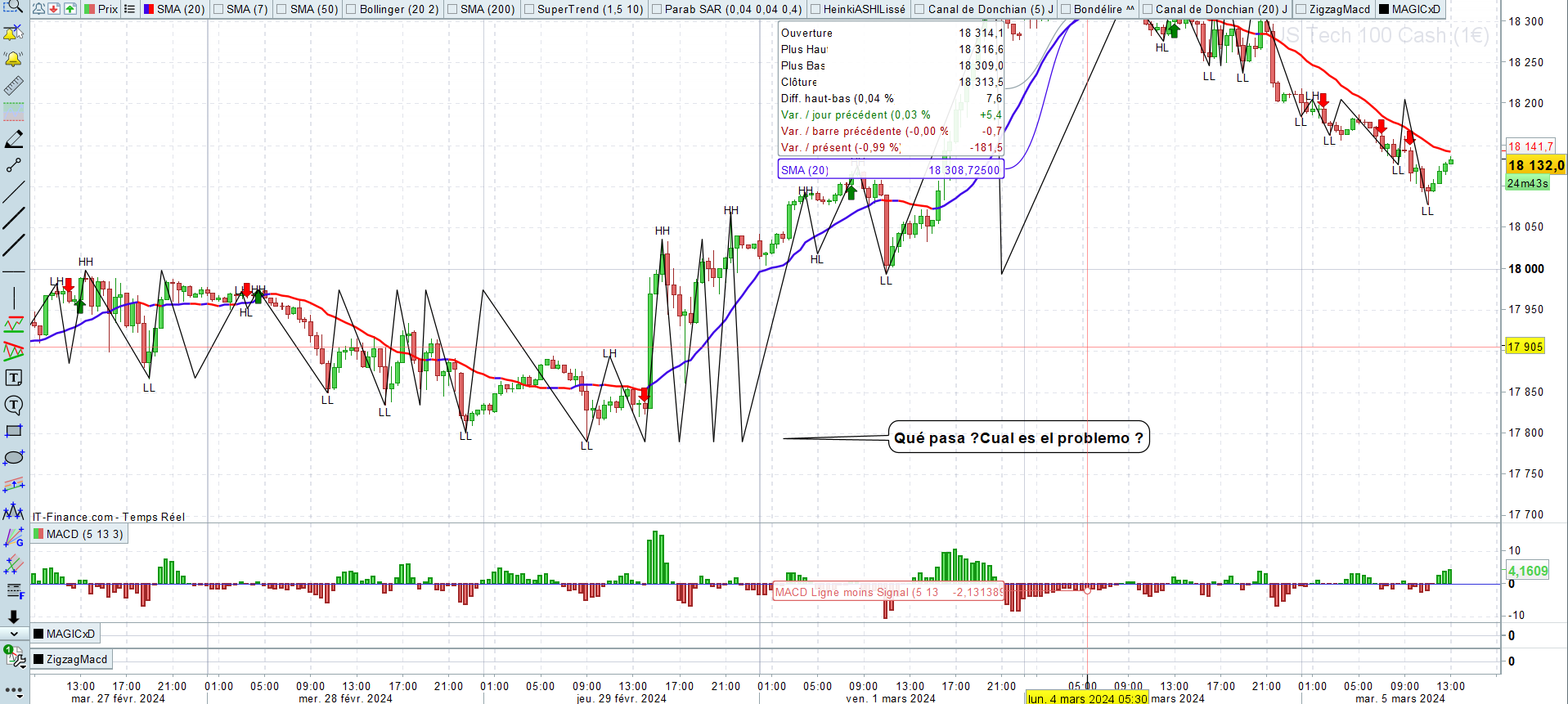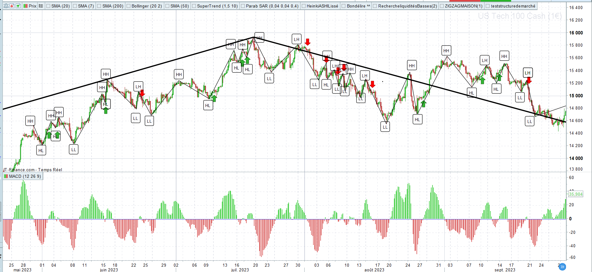 Si HH puis LL puis LH alors au prochain croisement de la MACD sous 0 = vente en espérant faire un LL