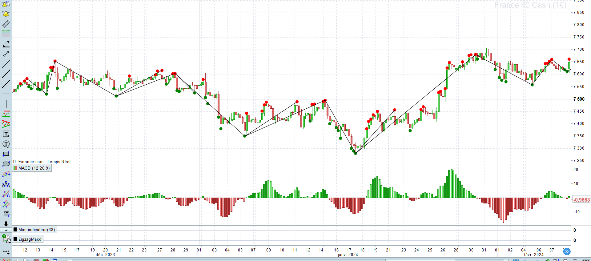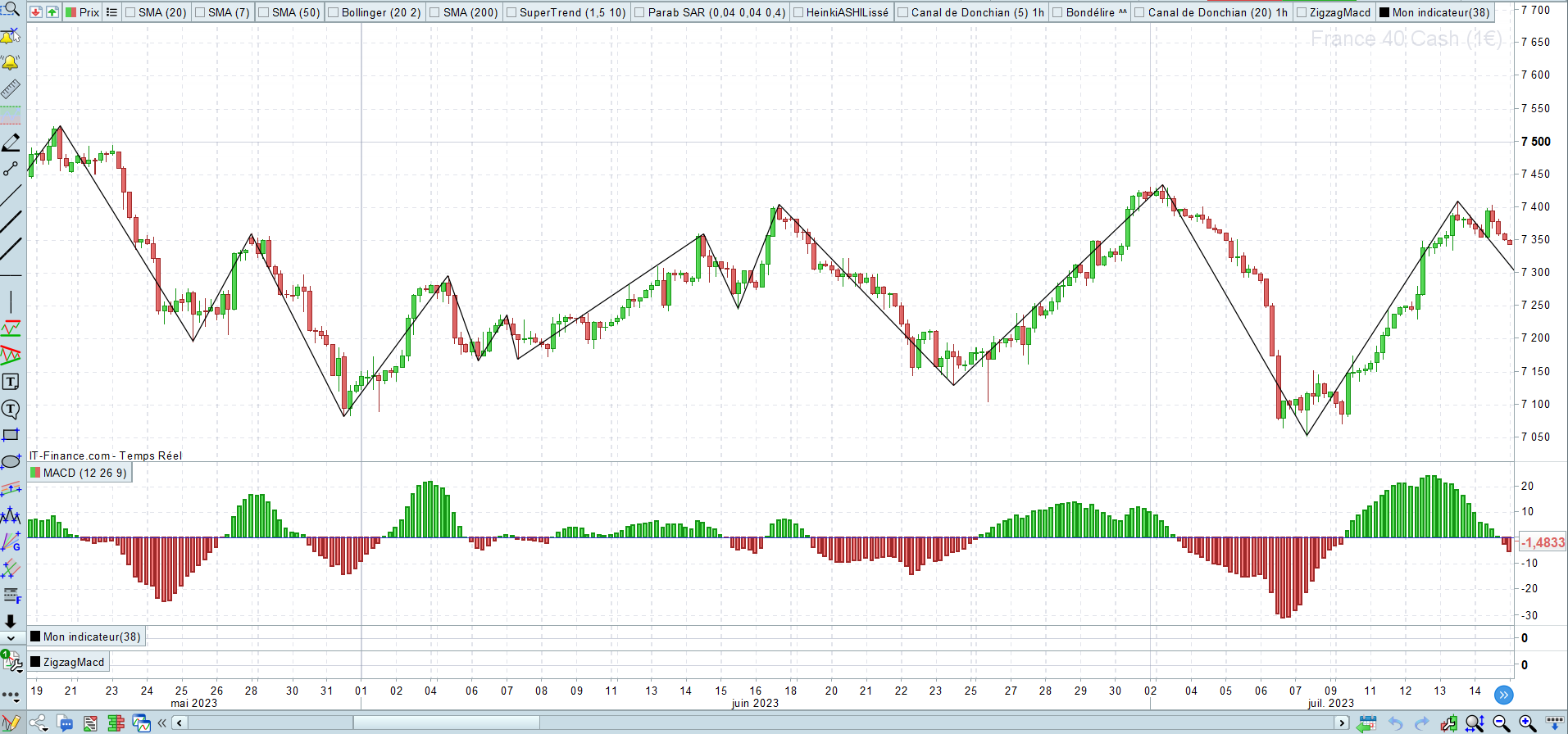Je voudrais avoir l’équivalent d’un indicateur zigzag mais les + haut et les + bas seront déterminés à partir des + hauts et des + bas des cycles MACD. J’espère que mon exemple est assez explicite.
