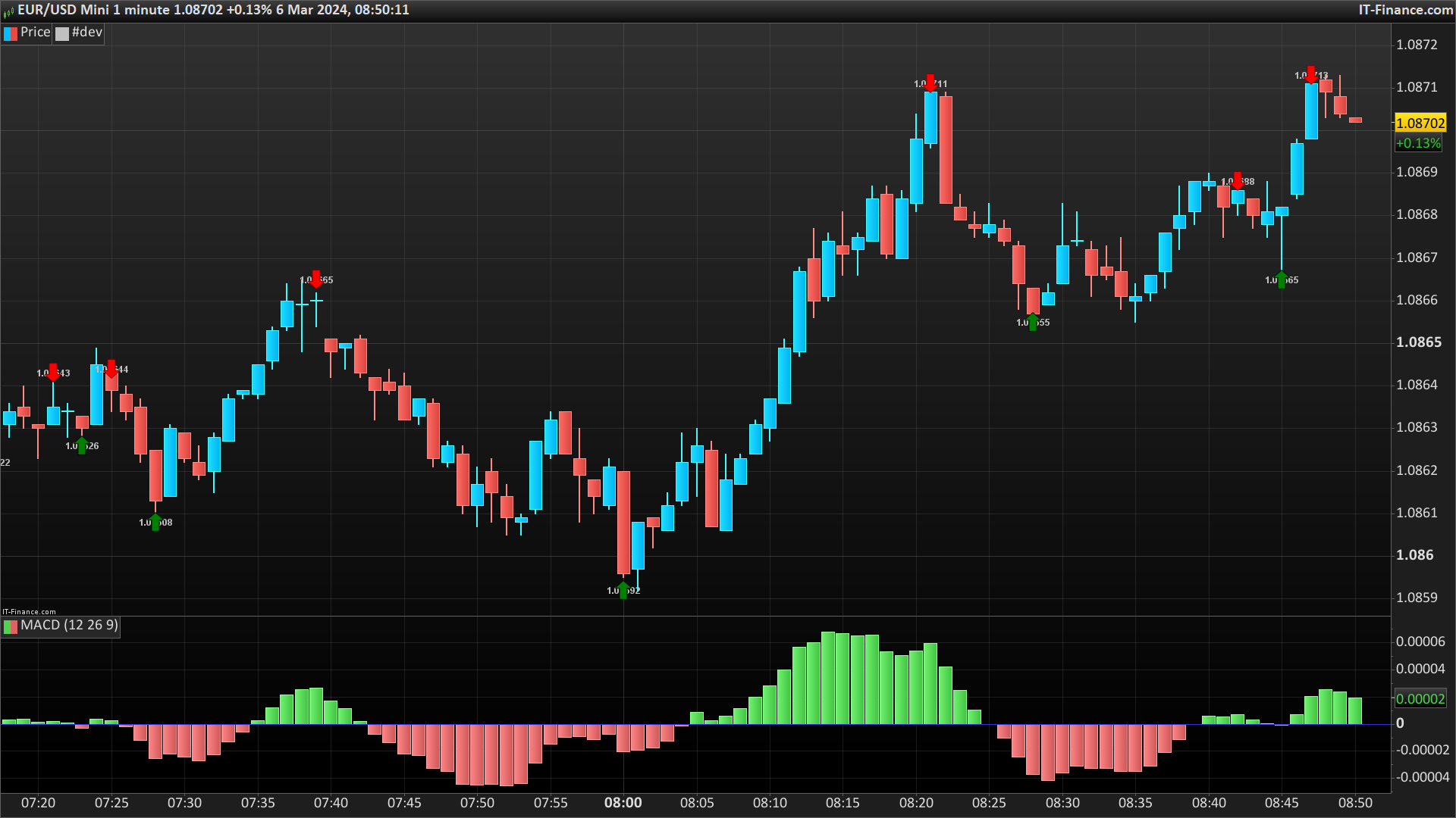 Voici une autre façon de marquer les points hauts et bas selon la position du MACD vis à vis de sa ligne 0 :