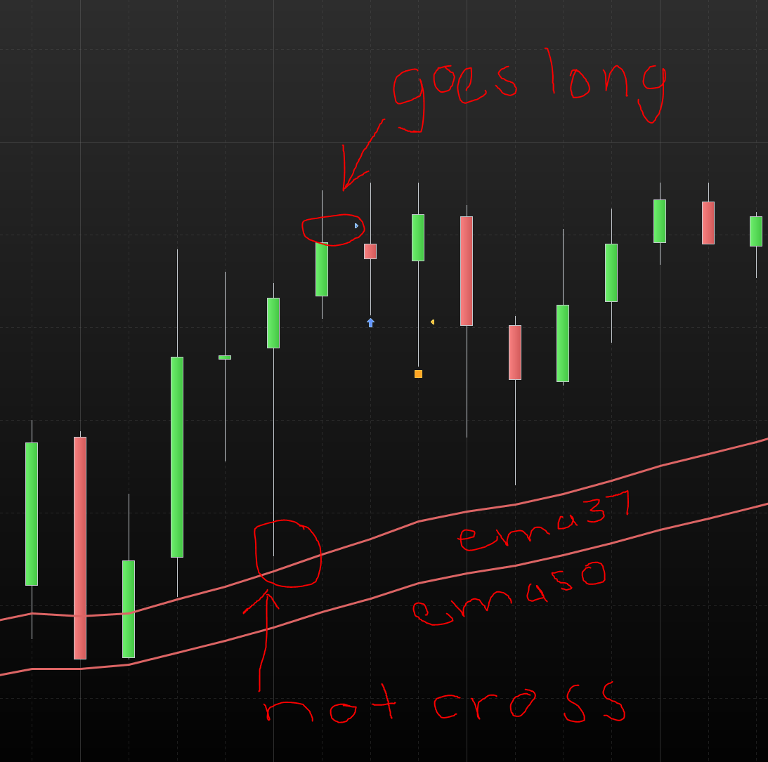 the low of the candle has not cross under the ema 37 line but still entered a long position. any reason why?