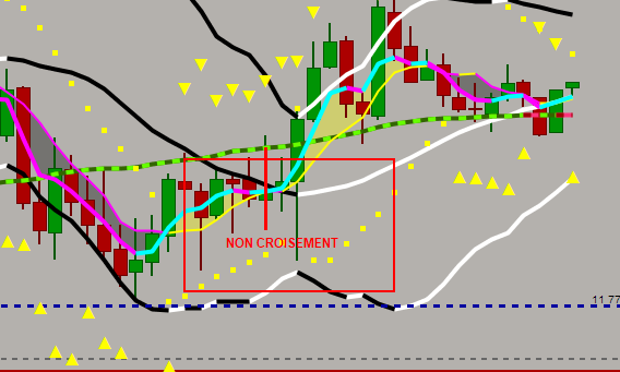 J’ai essayé de construire mon indicateur mais il me donne des résultats non souhaités à savoir que j’ai des flèches (jaunes) qui se répliquent et non pas une seule là où le non-croisement a eu lieu
