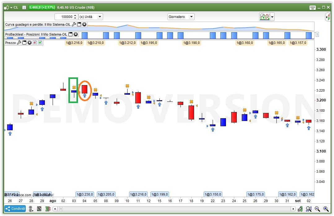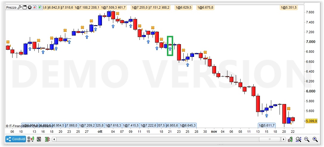 Credo tu confonda la candela di setup con quella di entrata. Qualla dove sotto c’è la freccia di entrata a mercato è la candela in cui è stata aperta l’operazione (cerchiata in arancio), ma sulla base delle condizioni verificate alla chiusura della candela precedente, quella di setup (nel rettangolo verde).