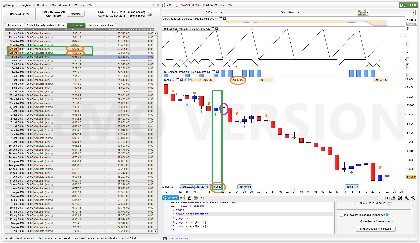 Il problema nasce sempre dai dati di fine settimana. ProOrder ENTRA comunque all’apertura della candela successiva al venerdi (perché venerdì 19 Ottobre è VERDE, o BLU’ nel mio caso), solo che la candela successiva è di DOMENICA e avendo deciso di nascondere i dati del fine settimana NON sa dove farti vedere la freccia di entrata in posizione per cui te lq visualizza sotto la barra precedente, Venerdì, che è anche quella di setup! Quindi è un effetto visivo, in realtà, come vedi dalla foto X nel dettaglio degli ordini lui entra il 21 perché la candela del 19 era rialzista).
