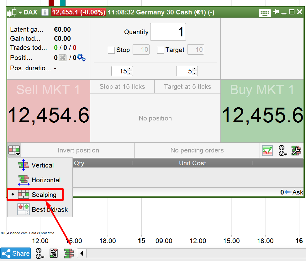 Encontrará la herramienta de scalping haciendo clic en el ícono de “order book”, justo debajo del gráfico de precios.