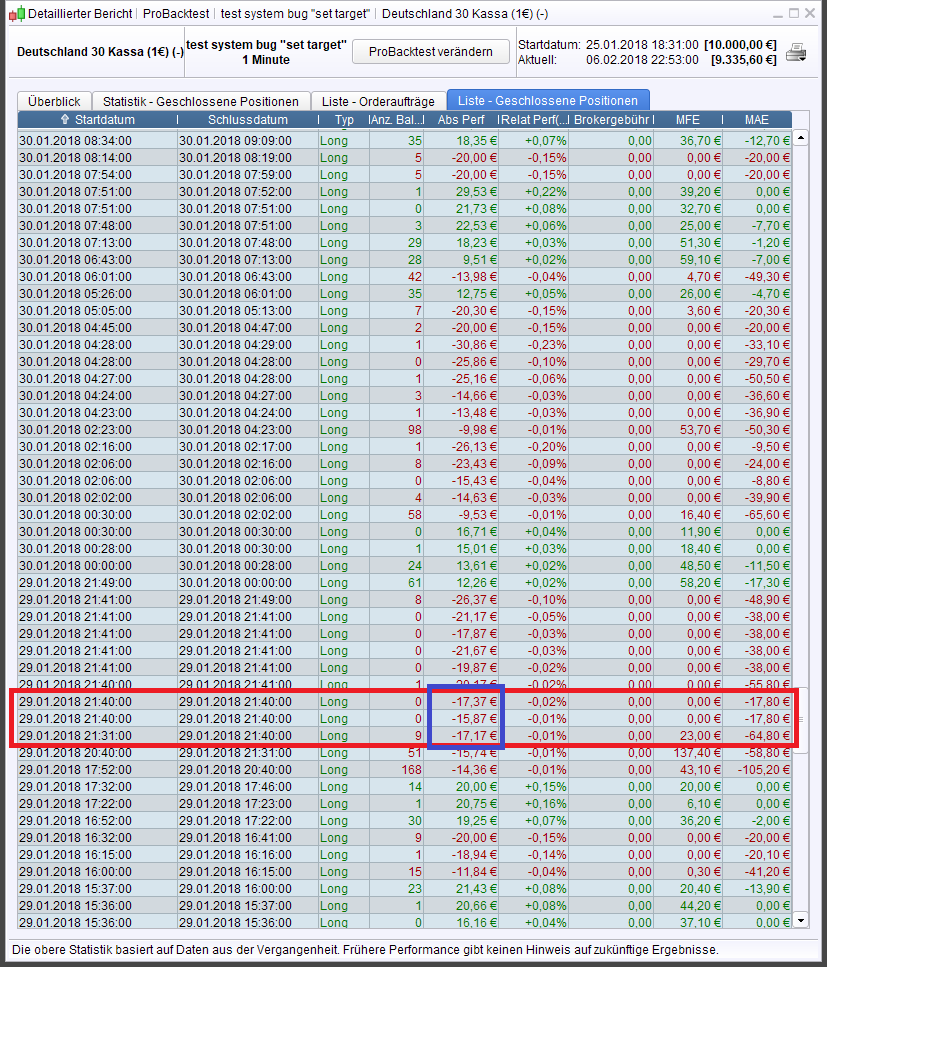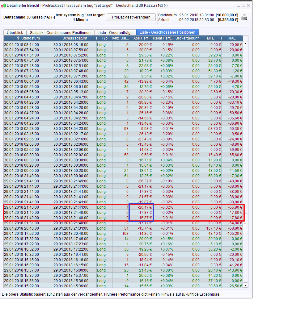 The backtest report tells us the same different exit prices for these 19 positions, 20 points away from their entry price :