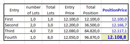 I am attaching an eXcel file with the calculations of POSITIONPRICE (hilighted in bold blue on yellow), which is an average price updated each new entry according to price and number of lots accumulated.