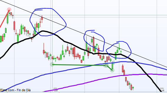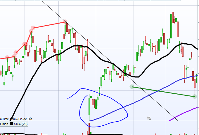 - Que mientras va cayendo la acción haga 3 máximos inferiores (foto 1 y 2) – Igual algo así como que el precio de 10 velas anteriores sea mayor que al actual y que a su vez este otra sea menor que otras 10 velas anteriores. Aunque esto creo que no producirá las ondas que se generan en el mercado y que busco