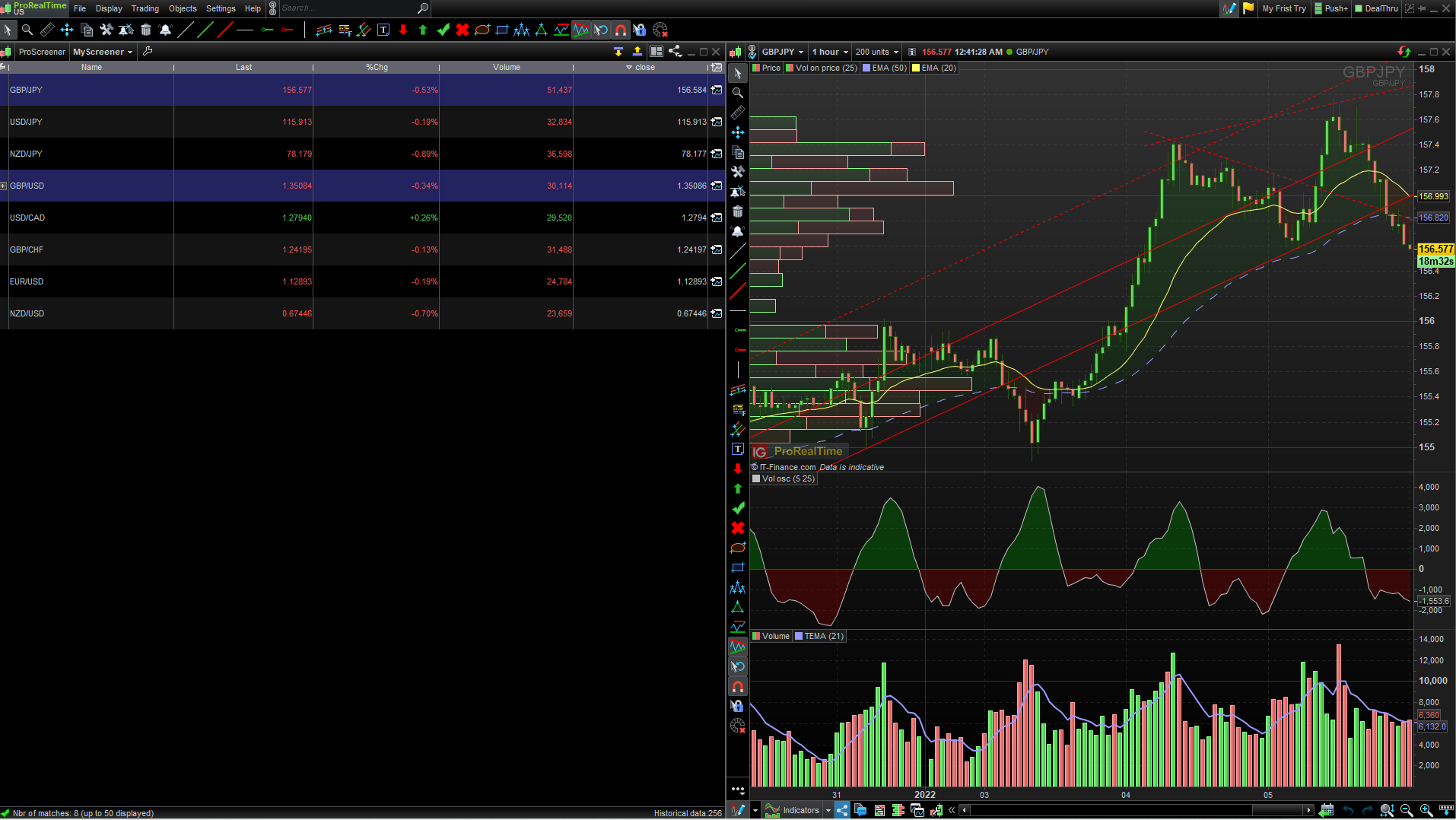 The first time frame is one hour with two moving averages an 8 period and a 21 period moving average. The second time frame is 15 minutes and has a 5 period moving average, a 13 period moving average, a 21 period moving average, and a 5 bar fractal.
