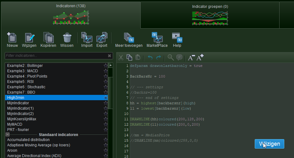 Once you select an indicator in the left panel, hover your mouse over the program code in the right panel. In there a button “Edit” (Wijzigen) will appear. Click that.