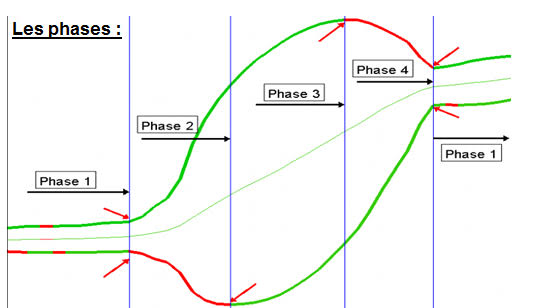 Phase 4 = la bande de la tendance (haute pour tendance haussière et basse pour tendance baissière) s’inverse et entre en opposition avec la tendance.