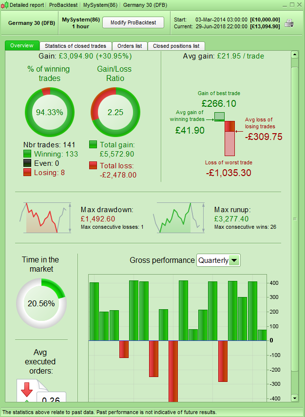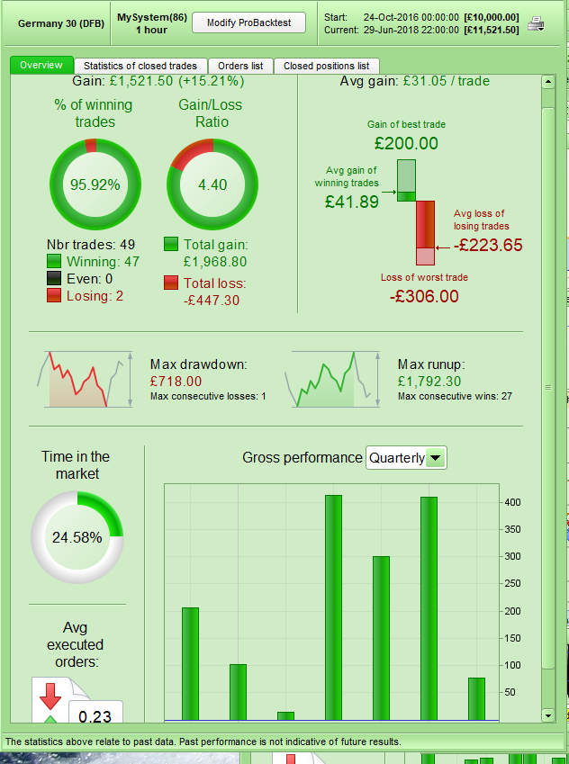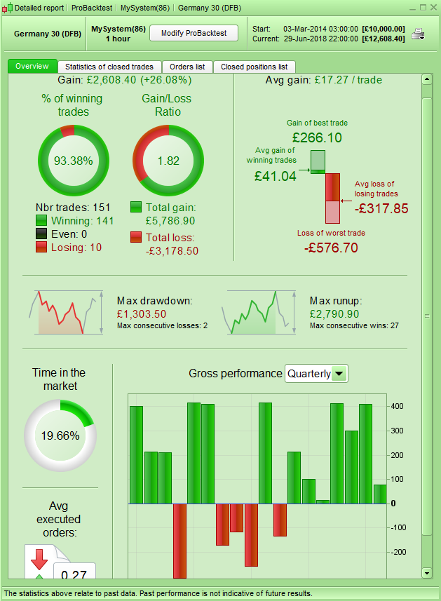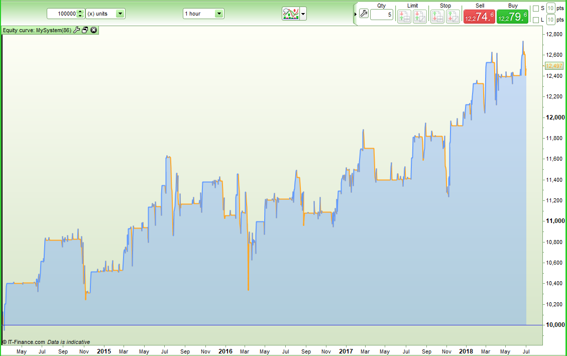 12345678910111213141516171819202122232425262728293031323334353637383940414243444546474849505152535455565758596061626364656667686970717273747576777879//ADX+RSIOMA Trend Follower by AlexF81//DAX 1H optimized on 100k barsDEFPARAM CUMULATEORDERS=true//time and daysdaysForbiddenEntry = OpenDayOfWeek = 6 OR OpenDayOfWeek = 0TODFromHour = 090000 //time of the dayTODToHour = 170000 //time of the dayinTimeInterval = time>=TODFromHour and time<TODToHour//indicatorsADX89=DI[89](close)ADX144=DI[144](close)trendlong=ADX89>0 and ADX144>0trendshort=ADX89<0 and ADX144<0ma=ExponentialAverage[14](WeightedClose)rsioma=rsi[14](ma)entrylong=rsioma crosses over 80entryshort=rsioma crosses under 20///////////////////////////////////////////if inTimeInterval and not daysForbiddenEntry and trendlong and entrylong thenbuy 1 contracts at marketendifif inTimeInterval and not daysForbiddenEntry and trendshort and entryshort thensellshort 1 contracts at marketendif////money management - breakevenstartBreakeven = 10 //how much pips/points in gain to activate the breakeven function?PointsToKeep = 2 //how much pips/points to keep in profit above of below our entry price when the breakeven is activated//reset the breakevenLevel when no trade are on marketIF NOT ONMARKET THENbreakevenLevel=0ENDIF// --- BUY SIDE ---//test if the price have moved favourably of "startBreakeven" points alreadyIF LONGONMARKET AND close-tradeprice(1)>=startBreakeven*pipsize THEN//calculate the breakevenLevelbreakevenLevel = tradeprice(1)+PointsToKeep*pipsizeENDIF//place the new stop orders on market at breakevenLevelIF breakevenLevel>0 THENSELL AT breakevenLevel STOPENDIF// --- end of BUY SIDE ---//sell sideIF SHORTONMARKET AND tradeprice(1)-close>startBreakeven*pipsize THEN//calculate the breakevenLevelbreakevenLevel = tradeprice(1)-PointsToKeep*pipsizeENDIF//place the new stop orders on market at breakevenLevelIF breakevenLevel>0 THENEXITSHORT AT breakevenLevel STOPENDIF//SuperTrend as Trailing and StopmySuper=1.5*Supertrend[3,10]if longonmarket and close crosses under mySuper thensell at marketendifif shortonmarket and close crosses over mySuper thenexitshort at marketendifset target pprofit 20007/01/2018 at 3:46 PM #75008By just making sure that any additional positions are only bought at a more favourable price you can improve the gain/loss ratio, gain per trade and win rate considerably and make a nicer equity curve. This is obviously at the cost of less trades which in real life is a good thing but for a back test result is a bad thing as you have a smaller data sample to build confidence in the results.