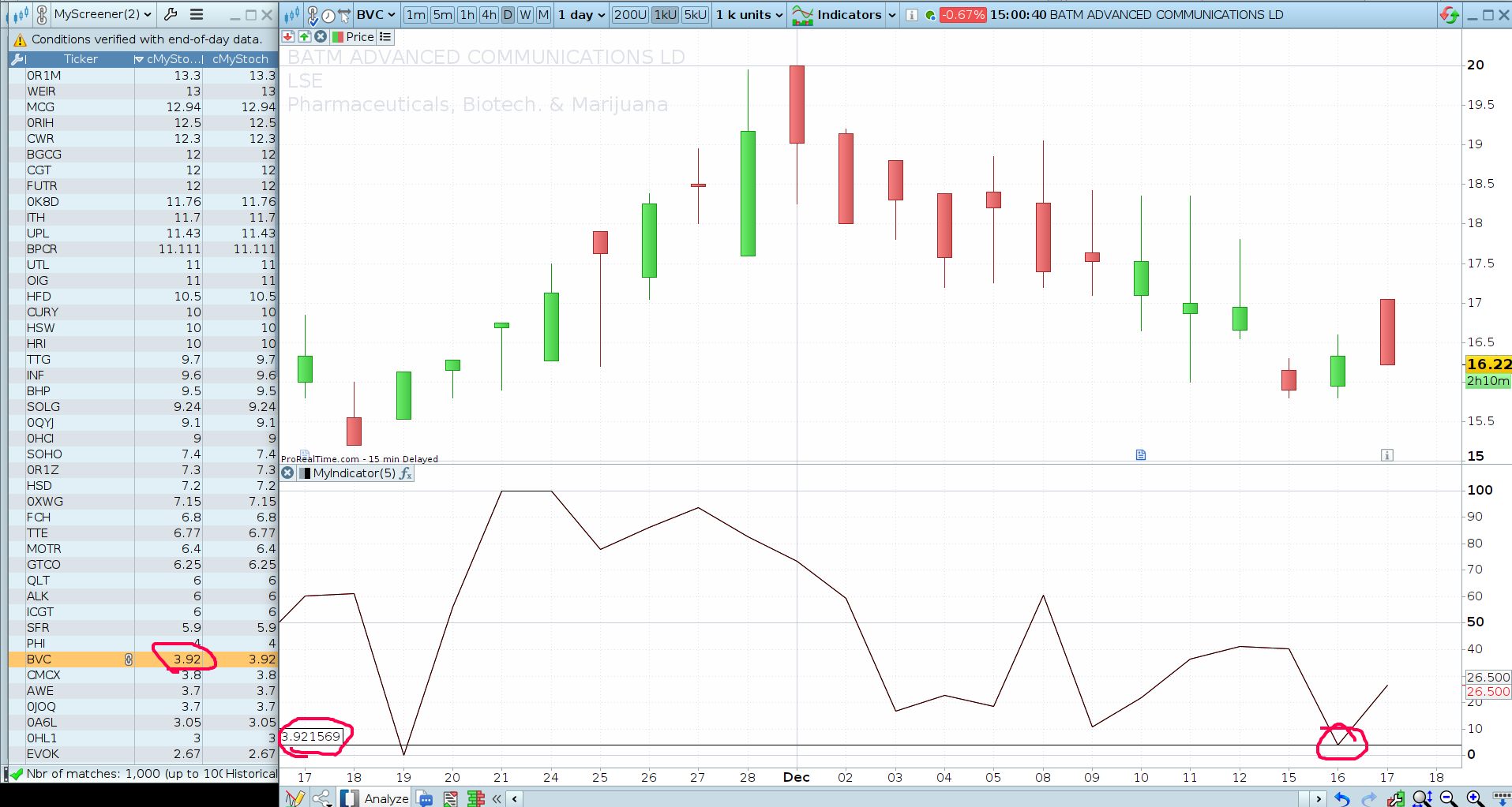 When i code up the same indicator in a screener, the screener returns a value of 32.8.