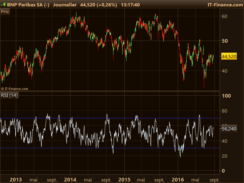 Désolé, je ne suis pas sûr de comprendre ? Ci-joint un graphique de BNP en daily avec le RSI associé, sous PRT-CFD. Que souhaiteriez-vous obtenir de plus ?