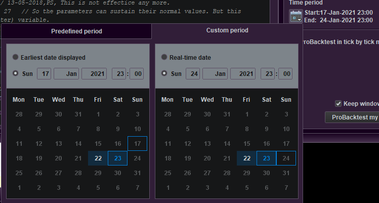 - In the same realm as the previous bullet-point, it is way tough to enter a date which is allowed in combination with the time. Thus, if the chart doesn’t go beyond (backwards) e.g. Jan 3 11:00 and the current time shown is 10:00, then gong back beyond Jan 4 is not possible because the time would be outside of the chart. So, change the time first (the other drag(s)). Do notice that we BackTest over time periods which are explicitly not equal to the chart content (this is necessary for a. different start times (BackTest robustness) and b. The sometimes (very) slowness of the back test itself for unnecessary large amounts of backtest data. And so we are always struggling with those stupid two forms. Take out the intelligence of what ranges are allowed (e.g. allow from 01-01-2000 to 31-12-4000 if I like to enter that) and half of the problems (if not more) are out of the way. But allow entering normal text.