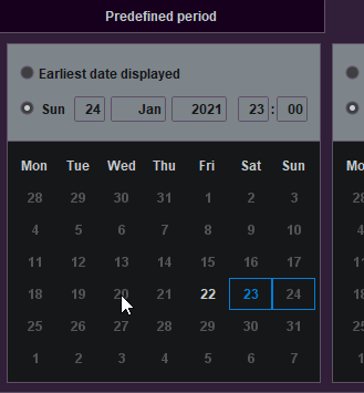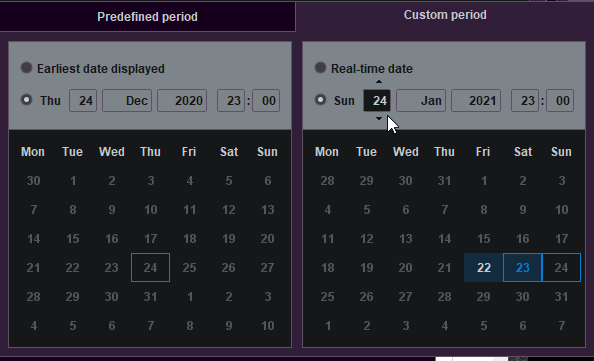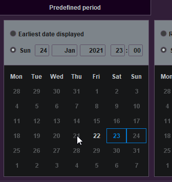 - Take the 3rd Attachment as example; What I had in there, was the 24th of December. Easy enough, scroll back the month one day. Remember, it is the 23rd today and I have data in there back to the 21st. There is now no-way to go back to the 21st or anything else than the 24th. See where the mouse arrow is. It is impossible to click there (greyed out which is a kind of justified, but meanwhile …). But what I can click is the 22nd. Aha. And after *that* I can suddenly use the up/down arrows again. Did I already suggest to try this yourself ? or are you afraid of getting mad before you succeeded.