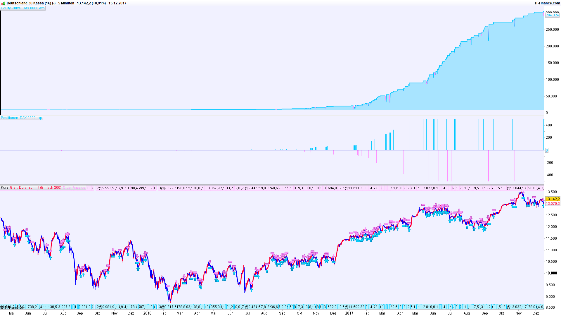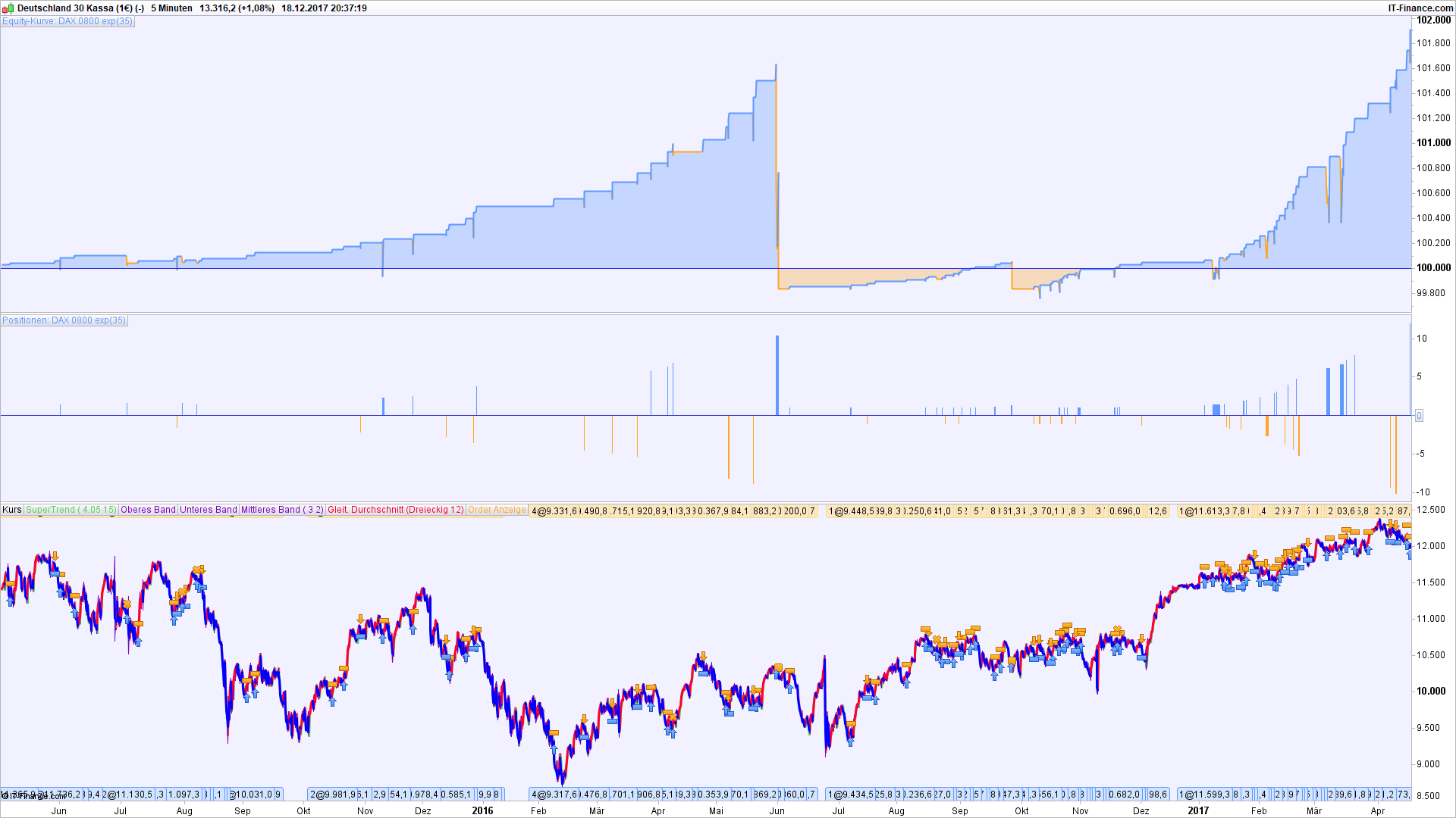 Trotzdem funktioniert das System hier erstaunlich gut, weil zum Beispiel der Bereich von Period (Zeile 9) ziemlich breit ist, in dem es gut läuft. Von Werten von ca. 100 bis 450 für Period bekommt man anständige Resultate ohne Riesendrawdowns.