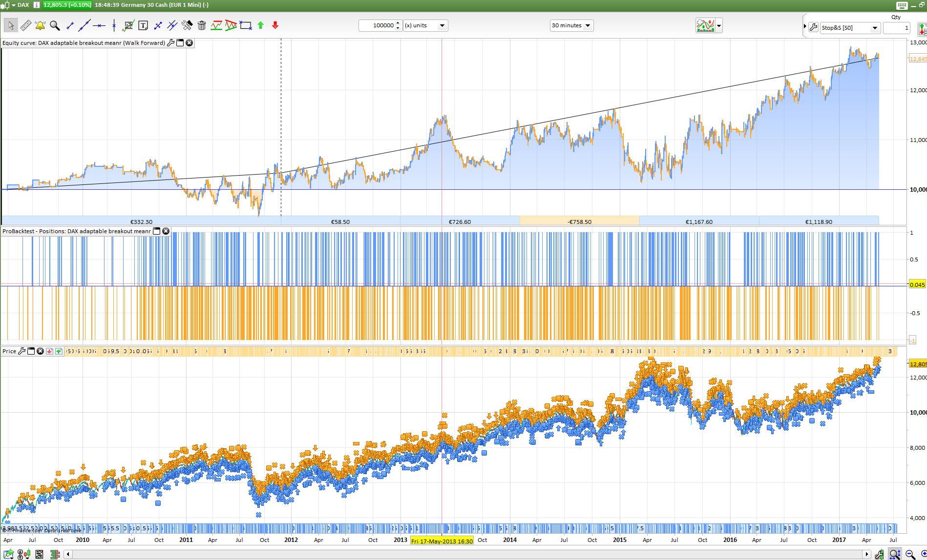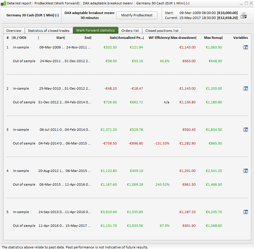 I ran a 5 iterations Walk Forward analysis yesterday (on 100k bars only) with the variables ranges you gave me (for the 30 minutes version), PFA the results. Even if the equity curve is not steady, the WF study is not so “critical”. Remember that in its current state, the WF tool only give the result of the most profitable OOS settings at the end, it doesn’t mean that other settings wouldn’t have made a more “steady” curve..