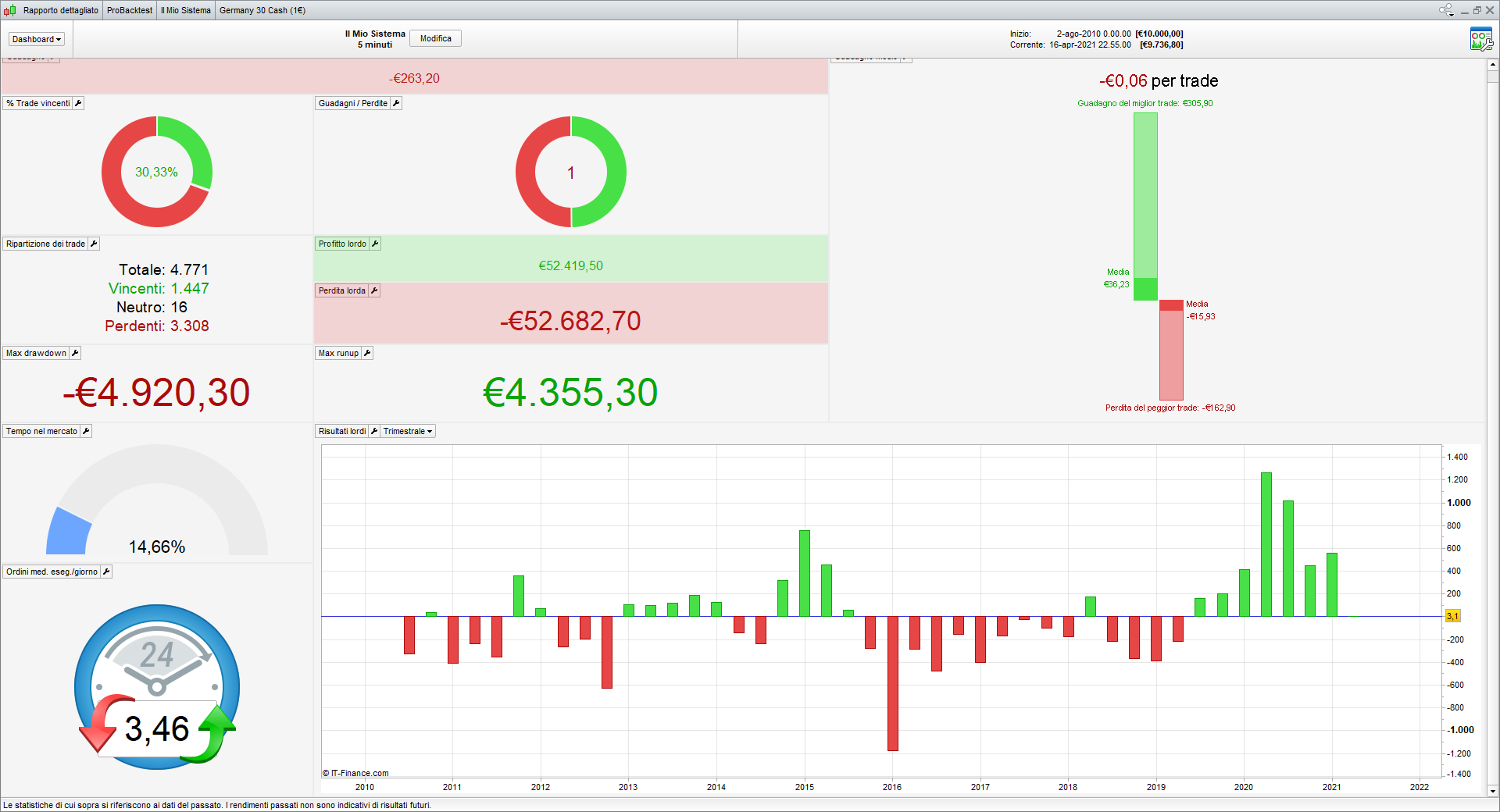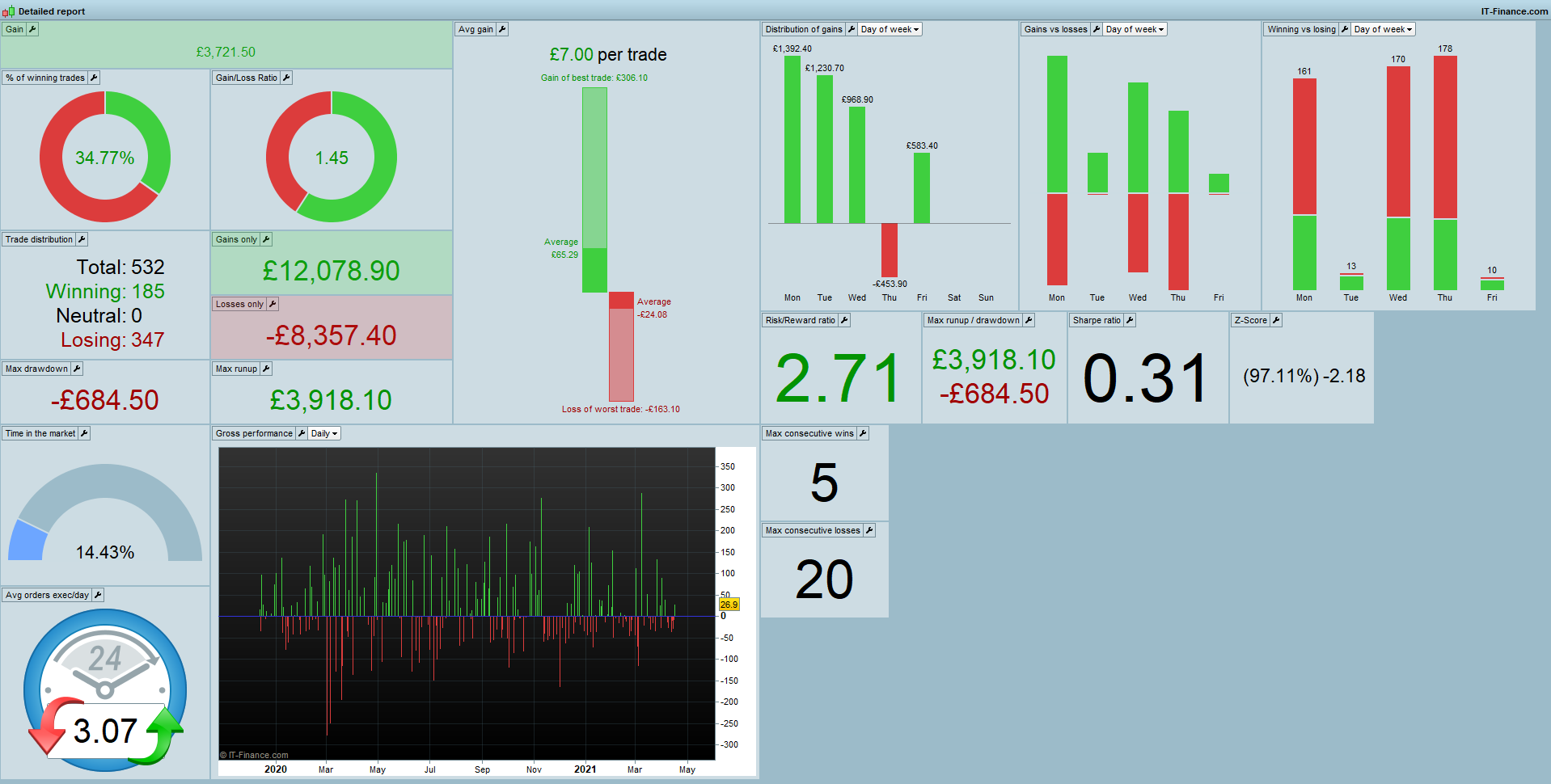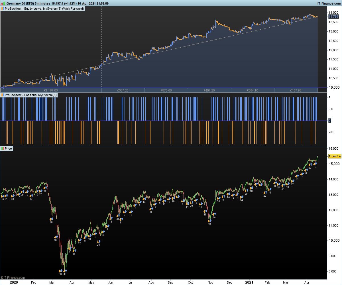 This system is purely experimental and probably curve fitted to a large extent. However, I did try to optimize some of the variables and I performed a number walk-forward tests. It was fun playing with different indicators and using the WF tool!