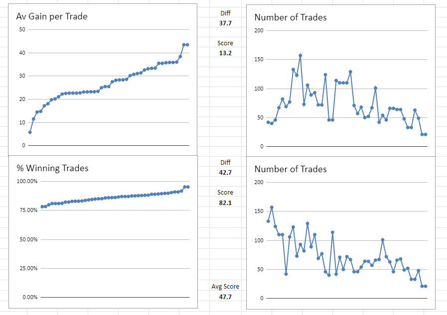 Regarding that analysis graph – I would ignore the trades where the number of trades is quite low as they are a poor data sample for a test – in fact I have taken to clearing those rows from the worksheet which results in a broken line but gives a more accurate score if they are at either end of the graphed line.