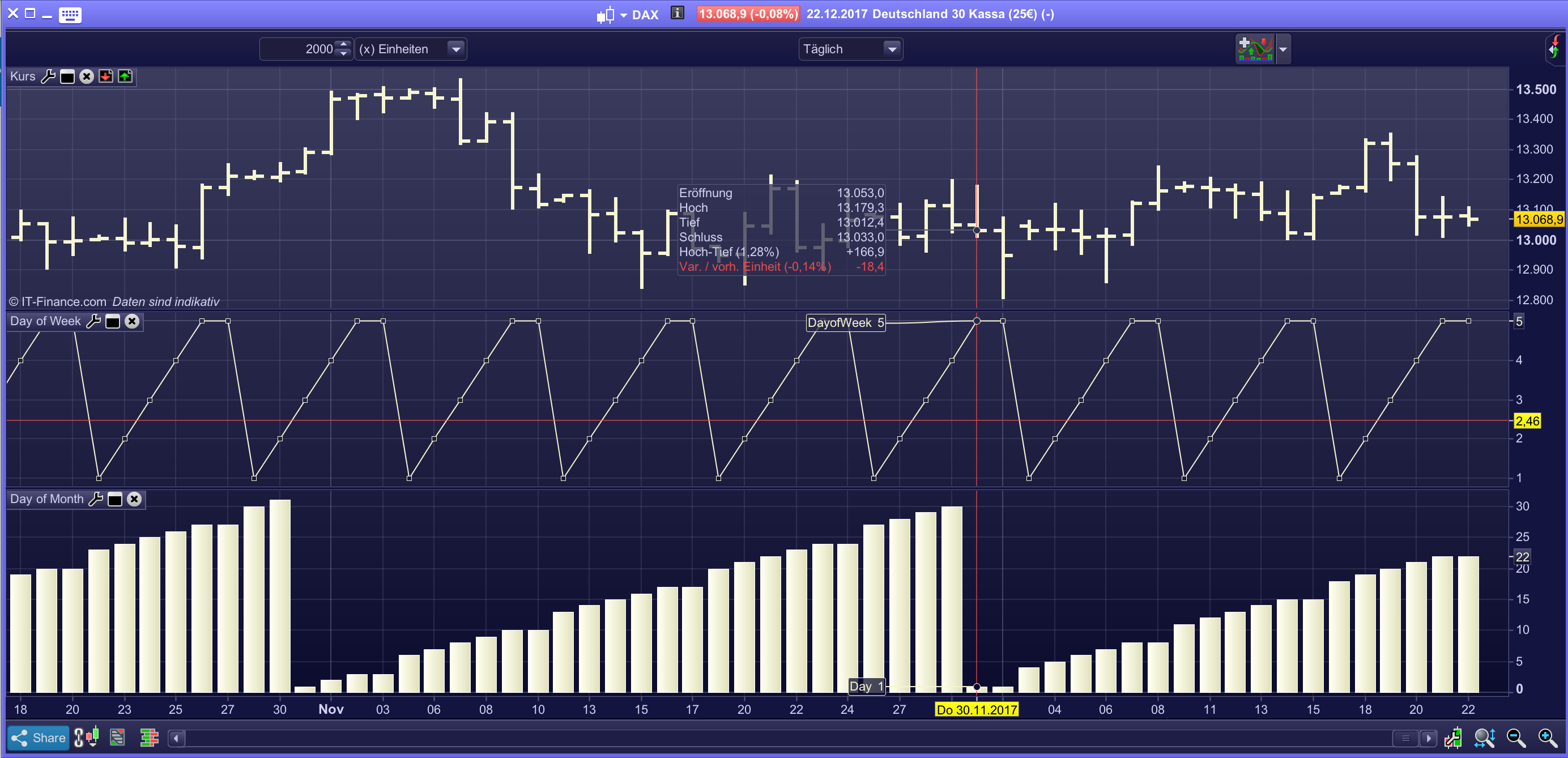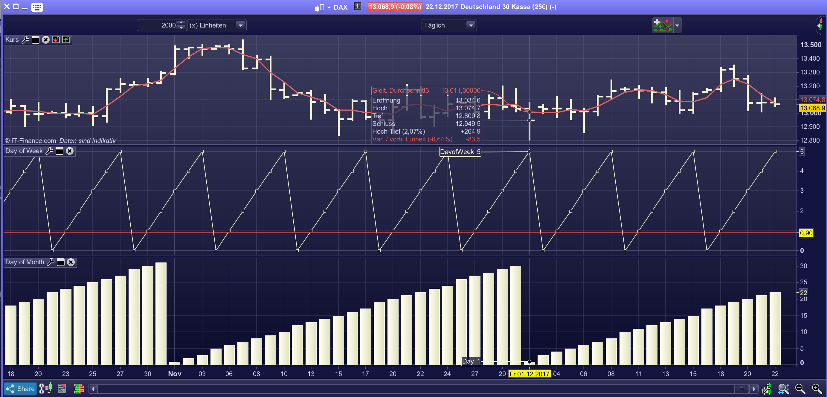 mir ist soeben aufgefallen dass der DayofWeek Indikator nicht richtig funktioniert. Bei diversen Märkten, u.a. DAX, zeigt er merkwürdigerweise für Do und Fr jeweils 5 an. Auch ist Sonntag mit 1 definiert, laut Handbuch sollte es aber der Montag sein. Die Funktion Day macht hier ähnliche Späßchen und zwar wird der letzte Tag des vorherigen Monats als 1 gezählt und dann der erste Tag des aktuellen Monats ebenso mit 1. Kann es etwas mit den unterschiedichen Handelszeiten oder den lokalen PC-Zeiten zu tun haben? Bei mir ist Mitteleuropäische Zeit eingestellt. Der Screenshot beider Funktionen sollte hier mehr Erklärung geben.