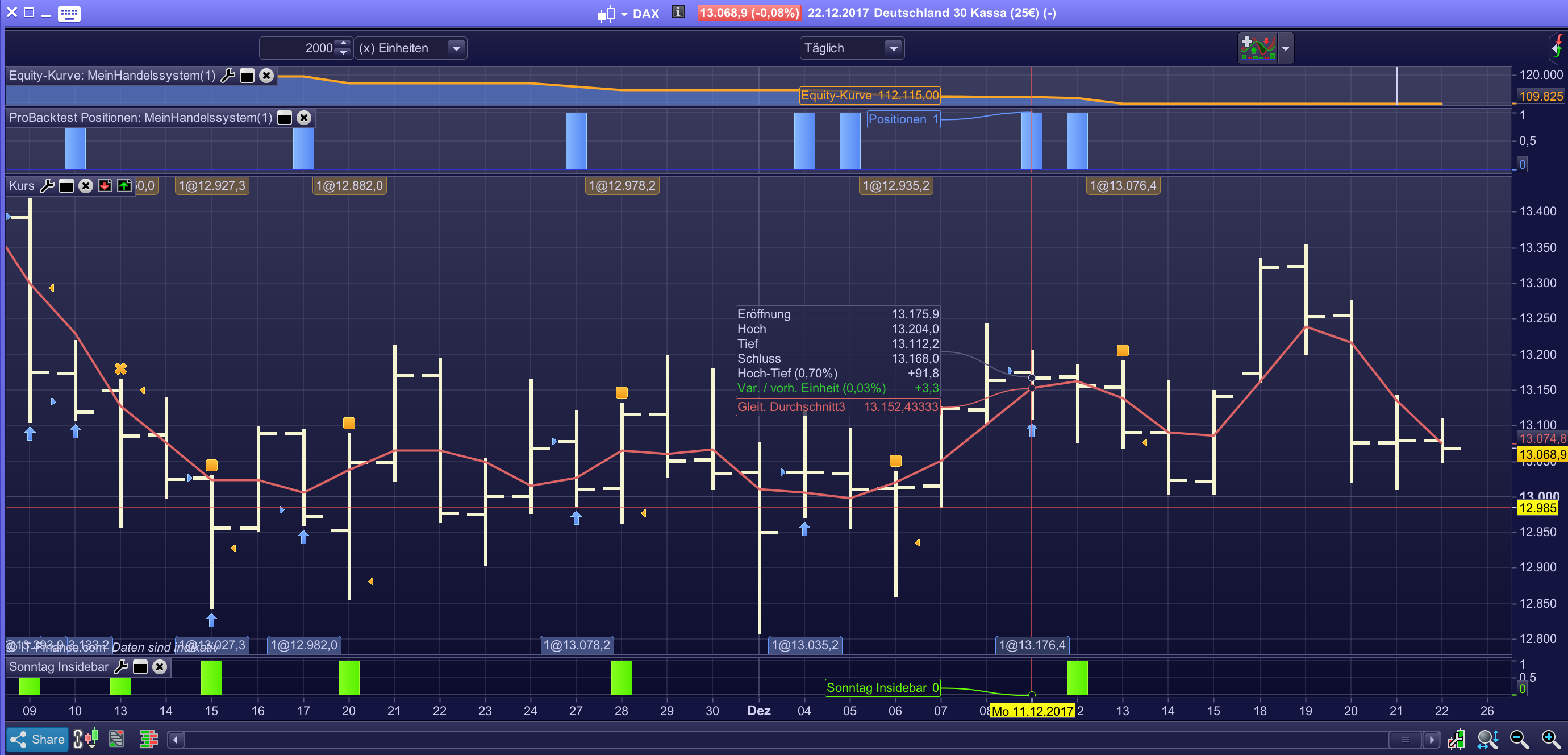 Habe ein weiteres Bild angefügt wo ich schnell mal eine Strategie basierend auf den grünen Indikator (InsideBar) angelegt habe. Wie am 11.12.2017 zu sehen ist, wurde ein Trade ausgeführt – obwohl davor Sonntag war und die sind nunmal meistens InsideDays – jedoch hat der Indikator nichts angezeigt.