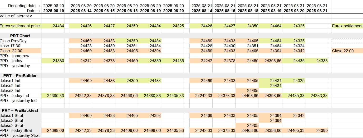 And for the die-hards a table with all the data I recorded, for the period 14 till 21 of august, on 2 consecutive days, 20 and 21 august. Green cells correspond with the EUREX settlements, orange-like ones correspond with 22:00 prices. The first block is for on chart prices and native PRT indicators, the second block for the equivalent ProBuilder results, and the third block for the equivalent ProBacktest results.