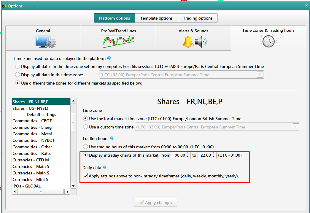 Donc ne pas oublier de cocher la case permettant d’appliquer la modification d’ouverture et fermeture du marché également aux graphiques non intraday.