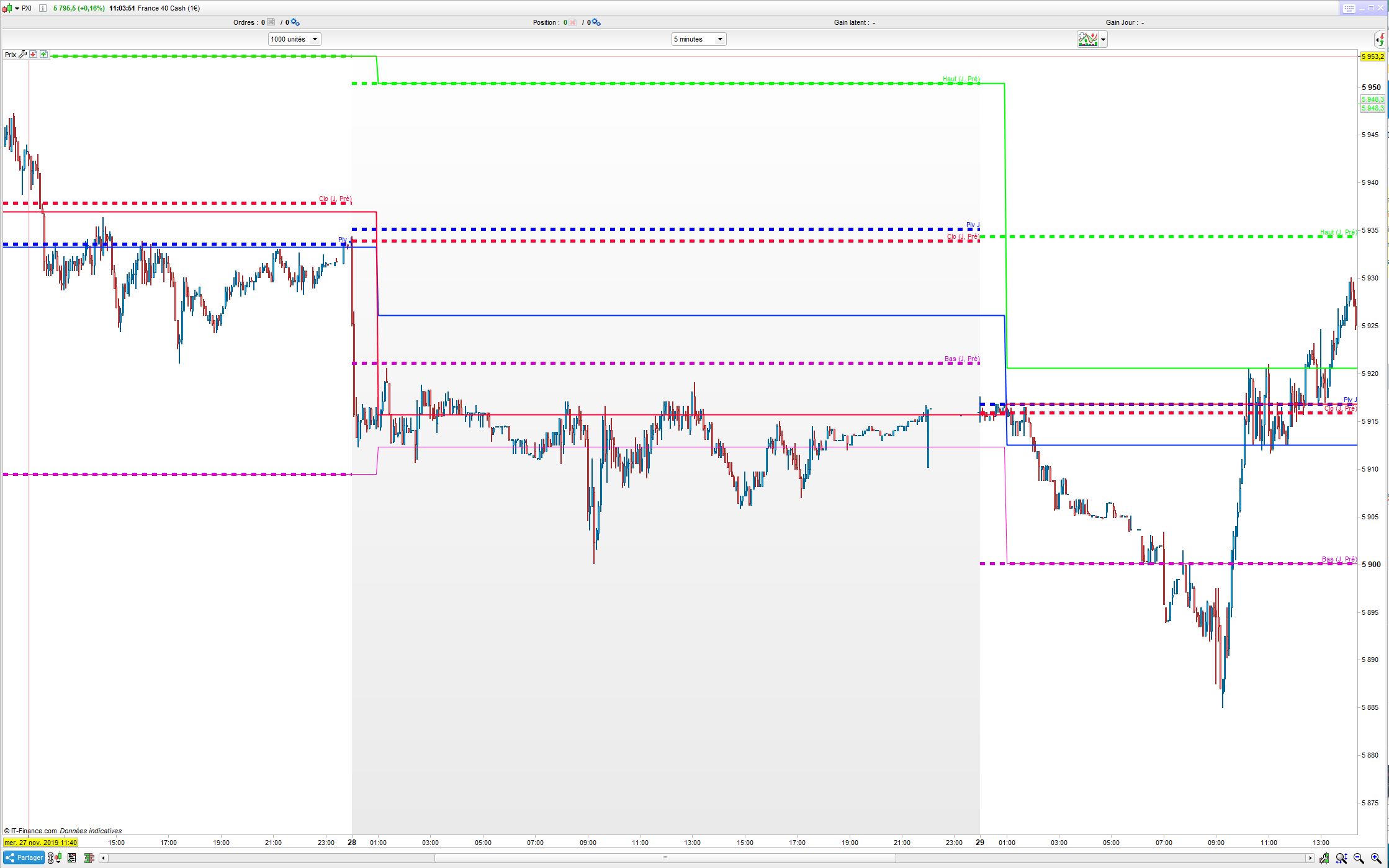En pointillés : les valeurs des plus hauts, bas, clôture de la veille et pivot fournis par indicateurs intégrés PRT.