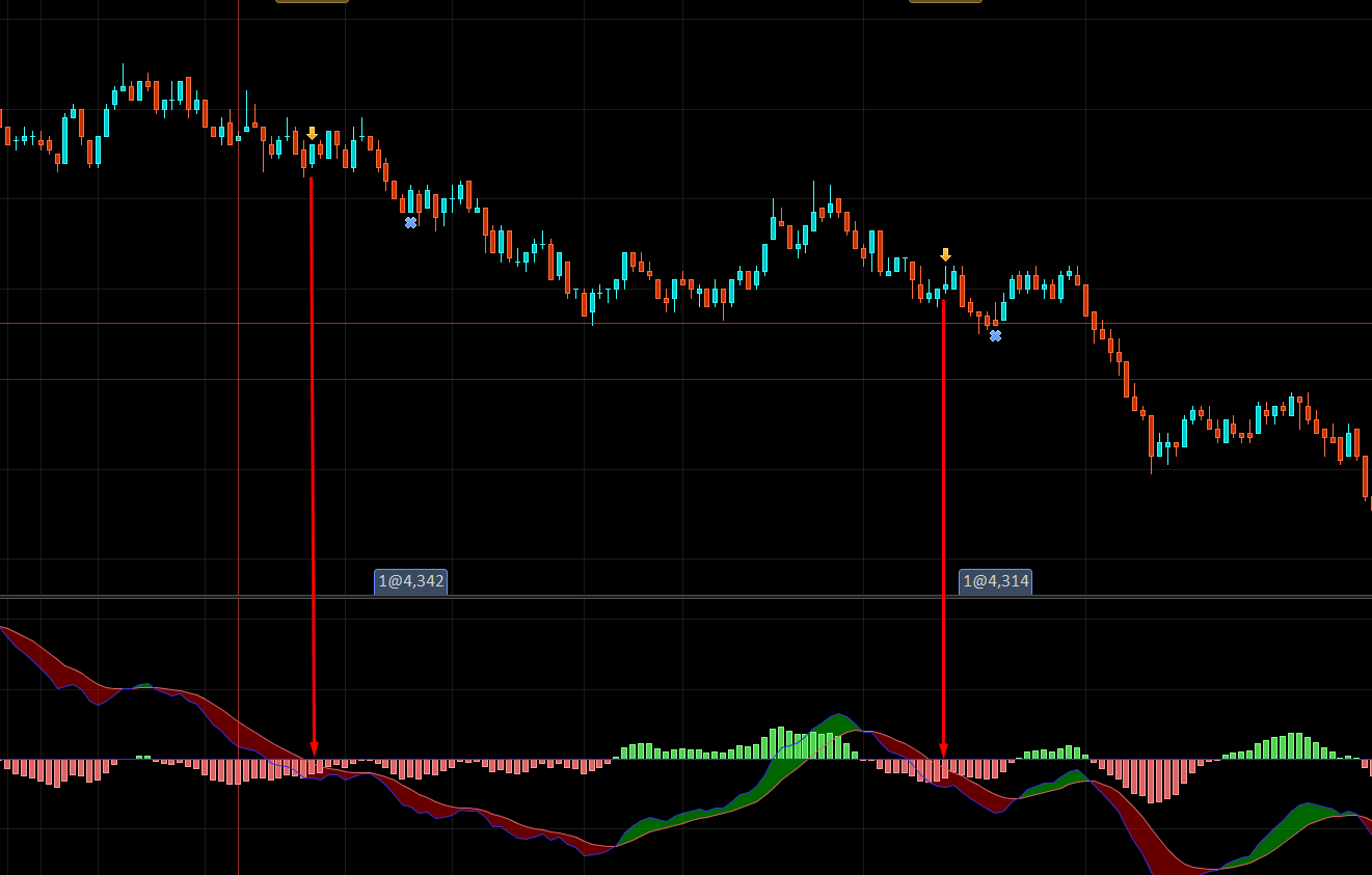 Cela me semble correct sur mon test ci-joint. La flèche du trade est bien sur la bougie d’après le croisement de la ligne 0 de la ligne de signal du MACD, telle que dans la stratégie (arrête moi si je me trompe 🙂 ).