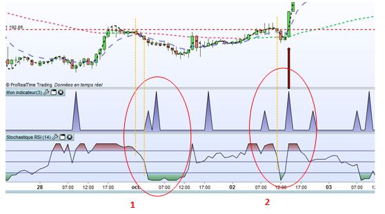 - un indicateur étant calculé sur une période X avec des données OHLC des bougies du timeframe observé, réduire l’unité de temps pour ‘aller plus vite’ ne fera que brouiller l’intention. En effet, une situation de survente en H1, ne l’ai pas en M5. Ne pas oublier qu’une stochastique, c’est juste la variation en pourcentage du prix entre 2 bornes.