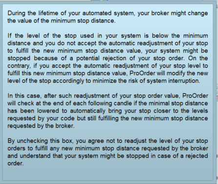 Please not that if you don’t allow it (unchecked box), your trading strategy will stopped after 10 rejection of your stoploss order not being in compliance with the minimal distance allowed.