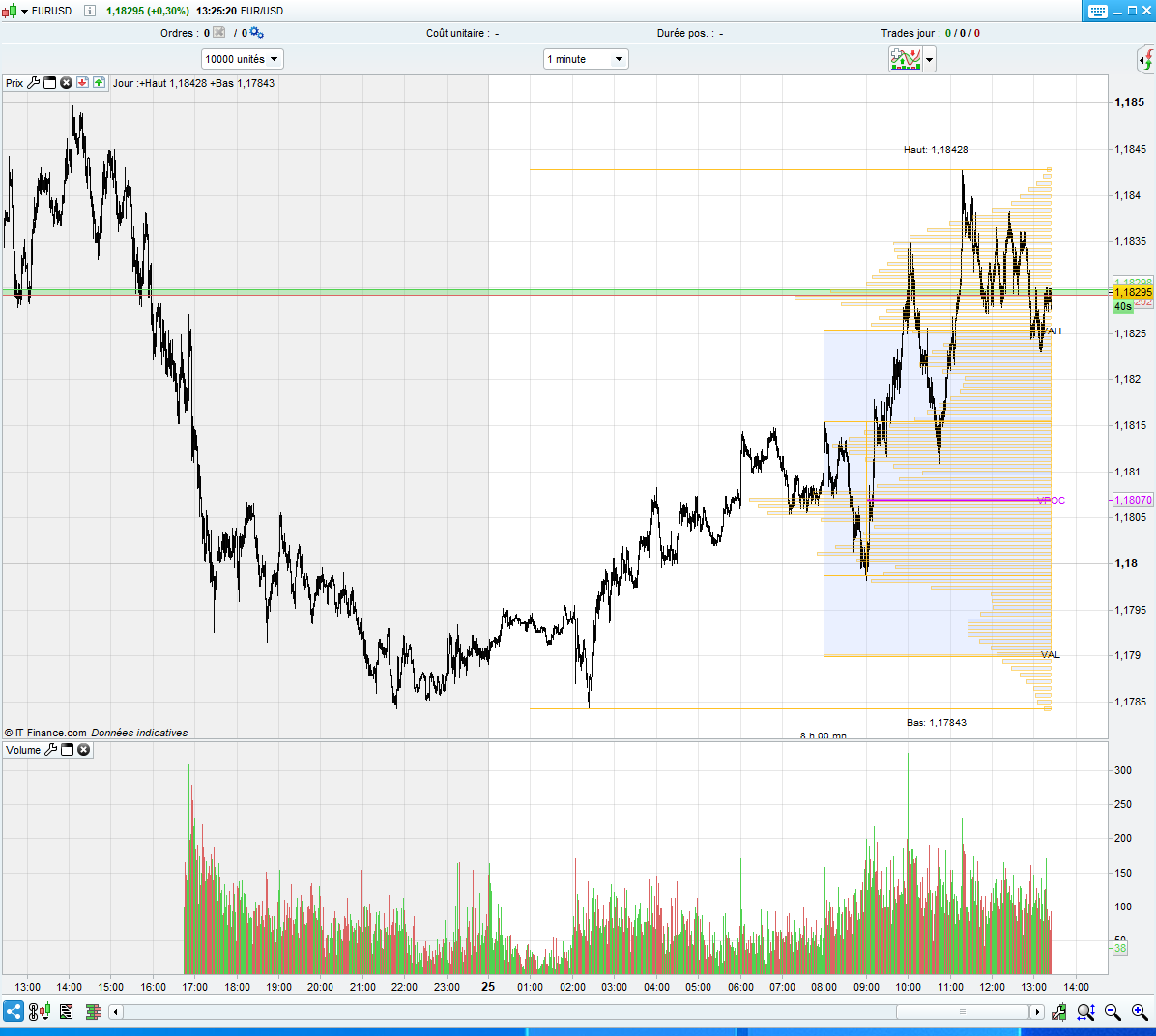 J’étais tranquillement en train de dupliquer un espace de travail France40 pour l’adapter à EurUsd, et après changé l’actif je trouve bizarre que certains indicateurs perso utilisant le volume soient toujours calculés à l’écran alors qu’ils ne devraient pas servir et que je m’apprêtais à les supprimer de l’espace de travail pour pas encombrer… Dans un premier temps je crois à un retard à l’affichage, je bascule en ut1 tout est recalculé sous mes yeux, et ce qui utilise le volume est toujours présent, en particulier mon volume profile! Autant je suis habitué à le voir sur indices, autant sur cfd forex IG ça prend par surprise. Je rajoute les volumes sous le prix pour en avoir le coeur net… et là… effectivement, il y a des data volumes intraday sur EurUsd depuis hier 16h45 !!!