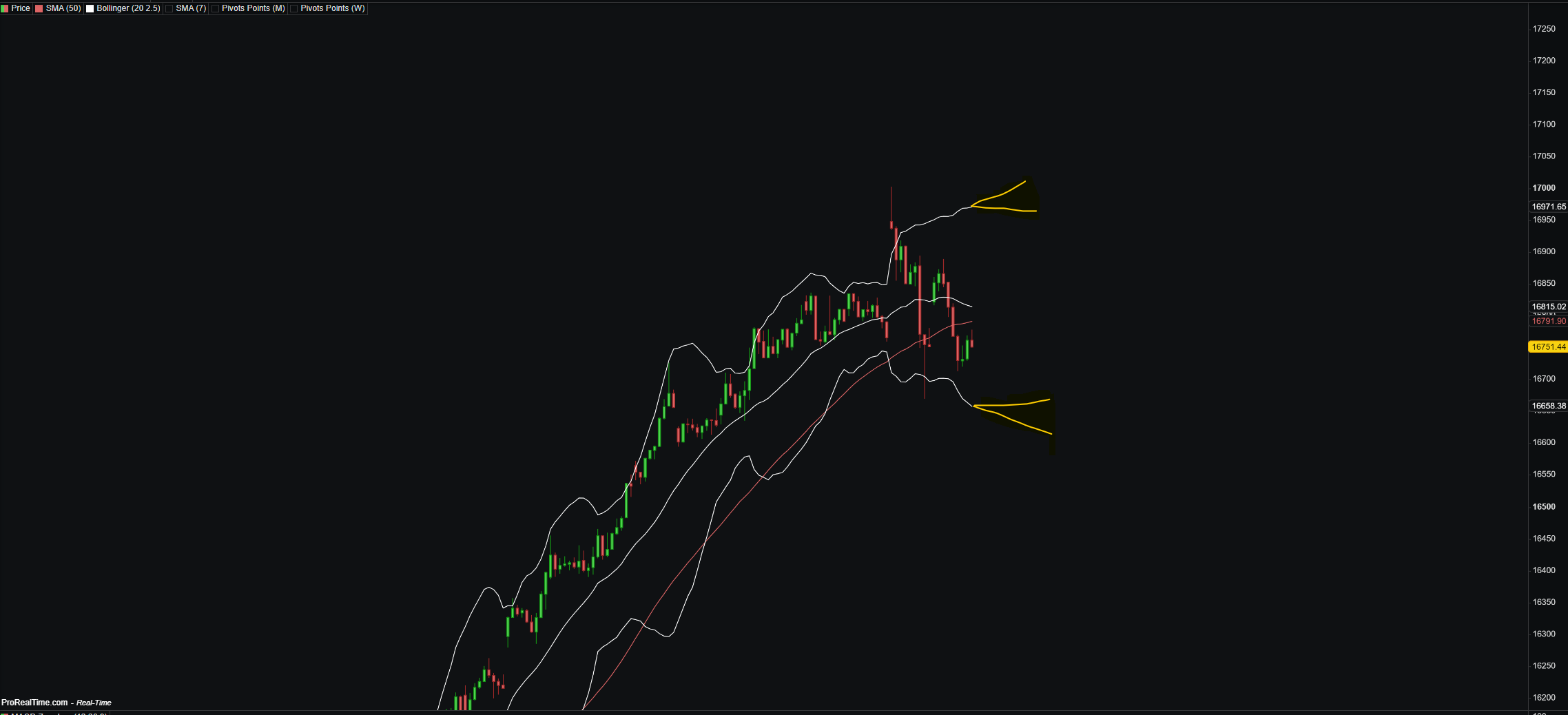 Pour ce qui est de la représentation, l’idée serait d’avoir une projection des bandes de Bollinger basées sur 2 cours imaginaires : un positif et un négatif.
