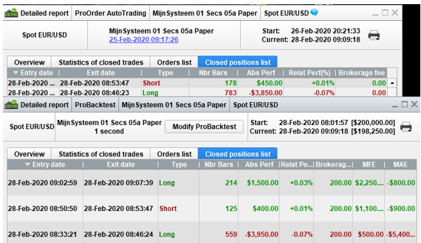 While the bottom one is automatically refreshed (a Paper Trading in real time running strategy), the Automatic Strategy is not refreshed. It will only refresh when it is crossed away and brought up again.