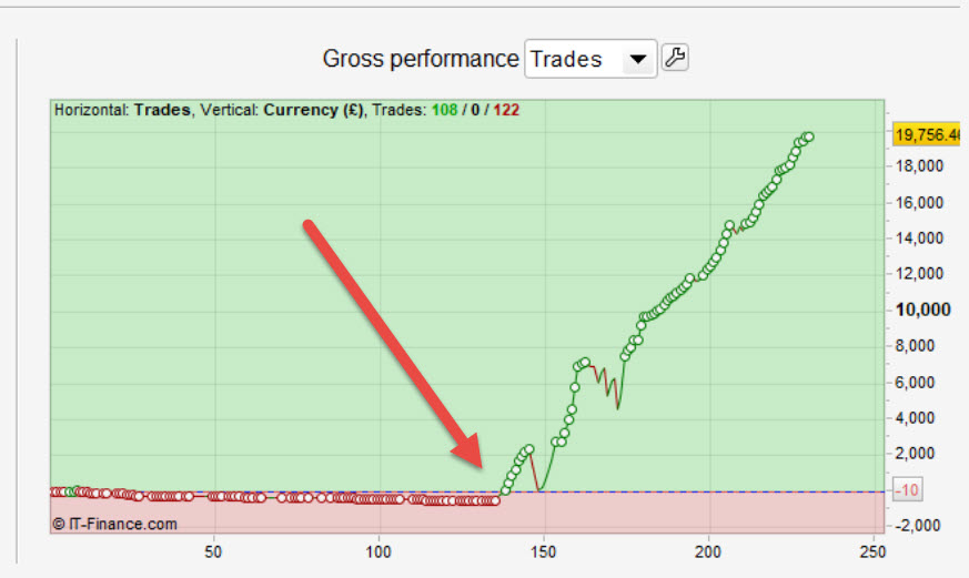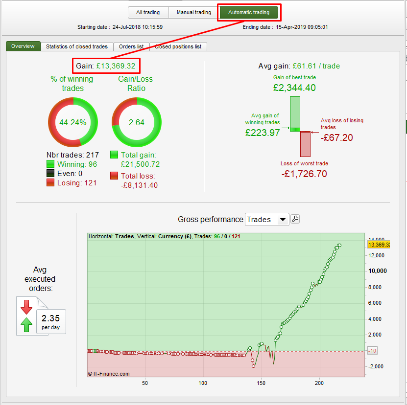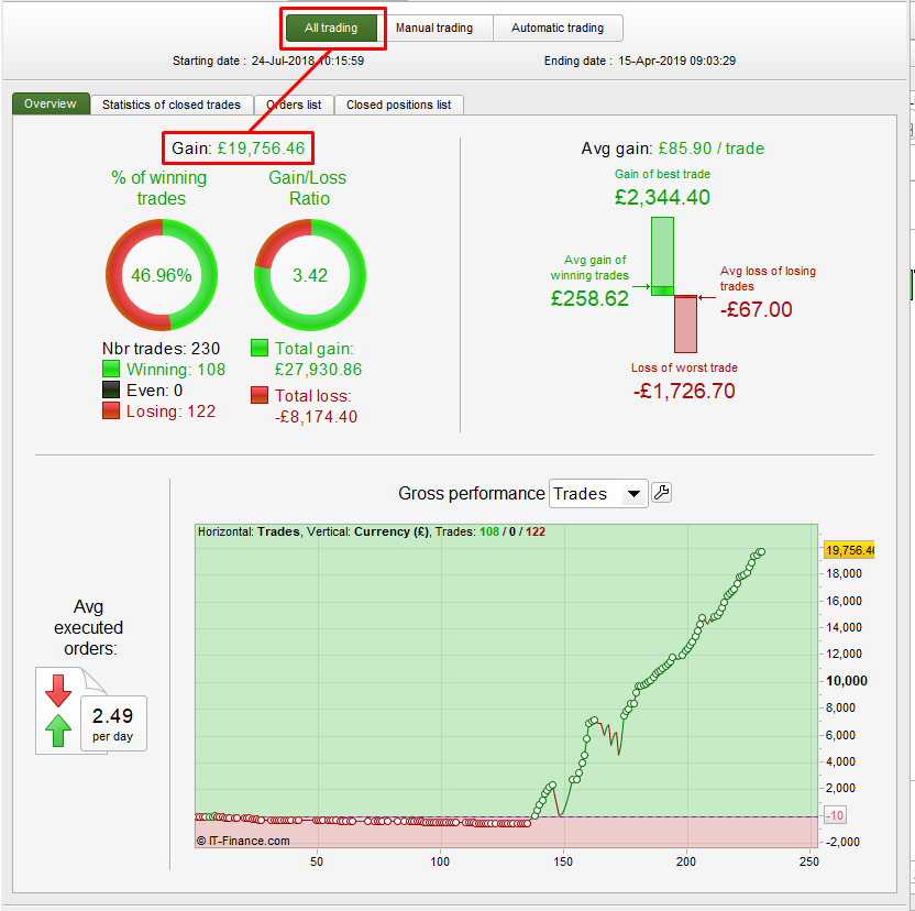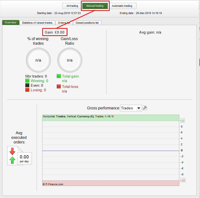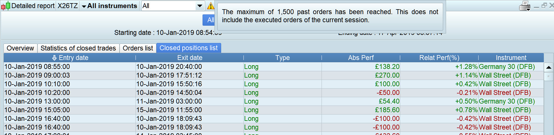 It appears that if you select ‘All Trading’ then it gives you the results of every trade that has ever happened on the account but if you select either ‘Manual Trading’ or ‘Automatic Trading’ it only gives you the results from a limited section of history (1500 trades I seem to recall – so only 750 buy and sells). If the information is there for ‘All Trading’ to display then why can we not be given it for the other two options? It makes little sense.