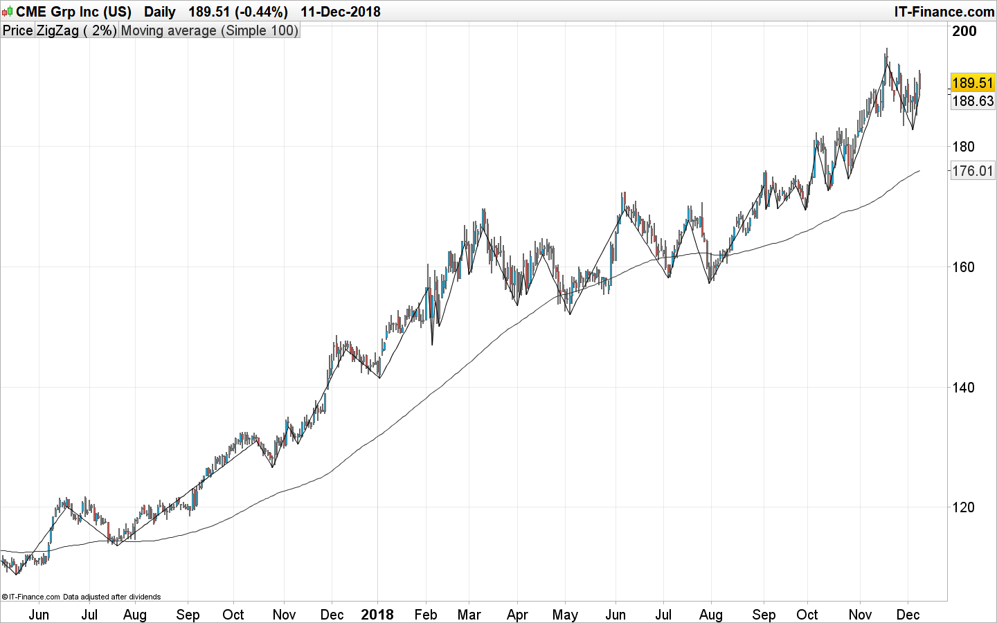 Pour la détection de creux, on peut utiliser une multitude de façon de détecter un plus bas. Dans l’exemple ci-dessous on utiliser un zigzag de 2 pourcents: