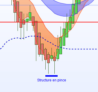 3/ Structures en pince (haussières ou baissières) : même chose en creux ou en sommet mais cette fois 1 à 5 bougies maximum s’intercalent entre les bougies A et B.