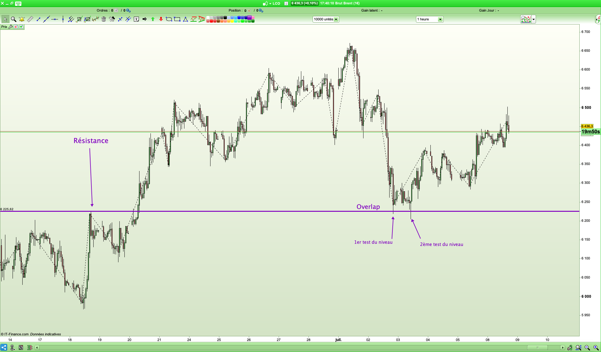 Dans l’exemple ci-joint, l’indicateur ZIGZAG est à 1% sur du BRENT en 1H.